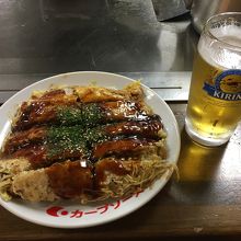 GWに広島観光に行った際に立ち寄りました。駅ビルのASSEの6階はお好み焼き屋が林立する階となっており、有名店は常に行列になっています。今回1人だったということもあり、廊下から店内の様子がわかるお店に入りました。定番の豚そばとビールを注文。ふりかけられたゴマがいいアクセントとなってました。ボリュームはありますが、キャベツが沢山入っているため、持たれたりはしないのが広島お好み焼きの特徴です。