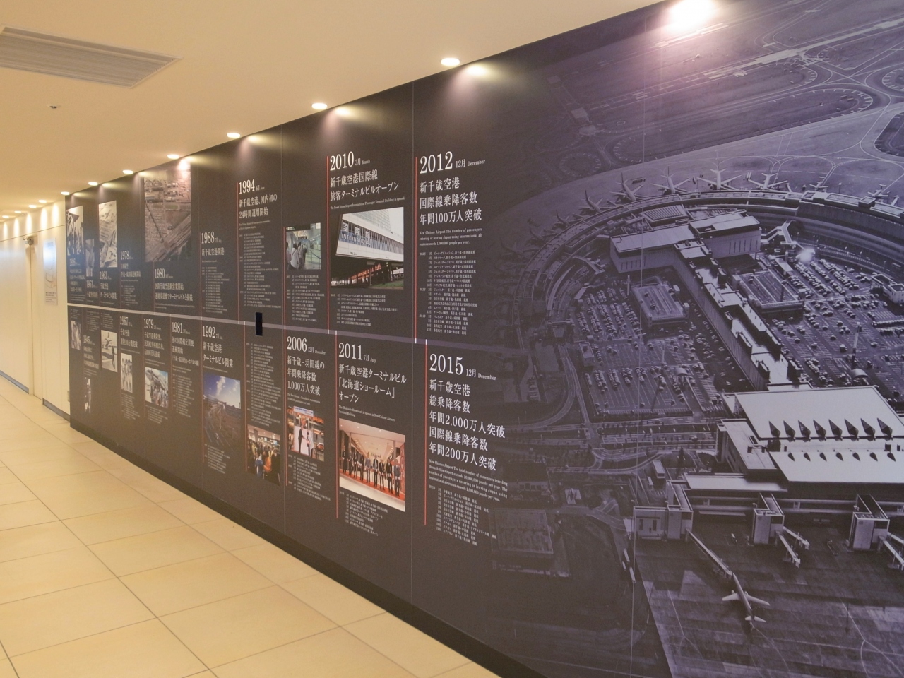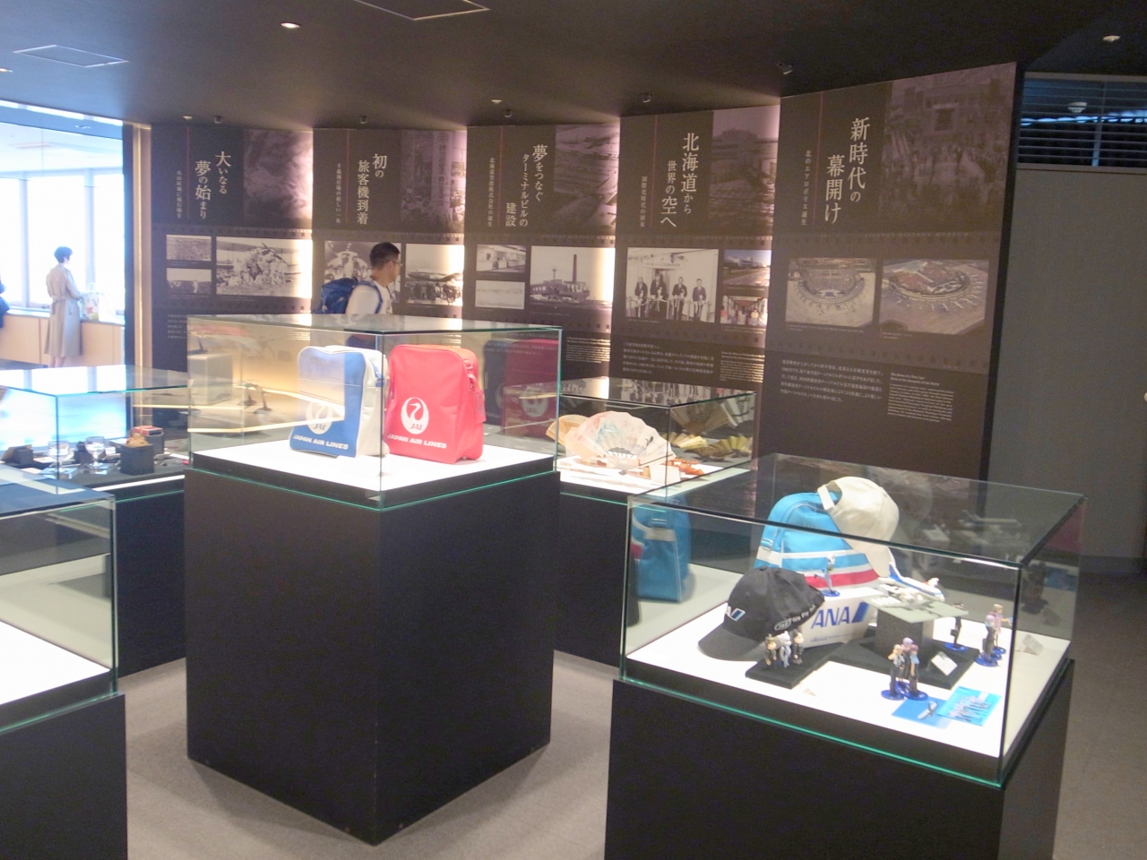 レストラン街で食事をして、スーパーラウンジに向かう途中にある。展示内容は、千歳空港の開設から今に至る歴史と、飛行機の航続距離など。そして、日本航空の女性客室乗務員の歴代の制服が展示されている。そして、海外旅行、飛行機利用が特別な層の時代に、日本航空を利用すると、JALとかかれたショルダーバックがもらえた。