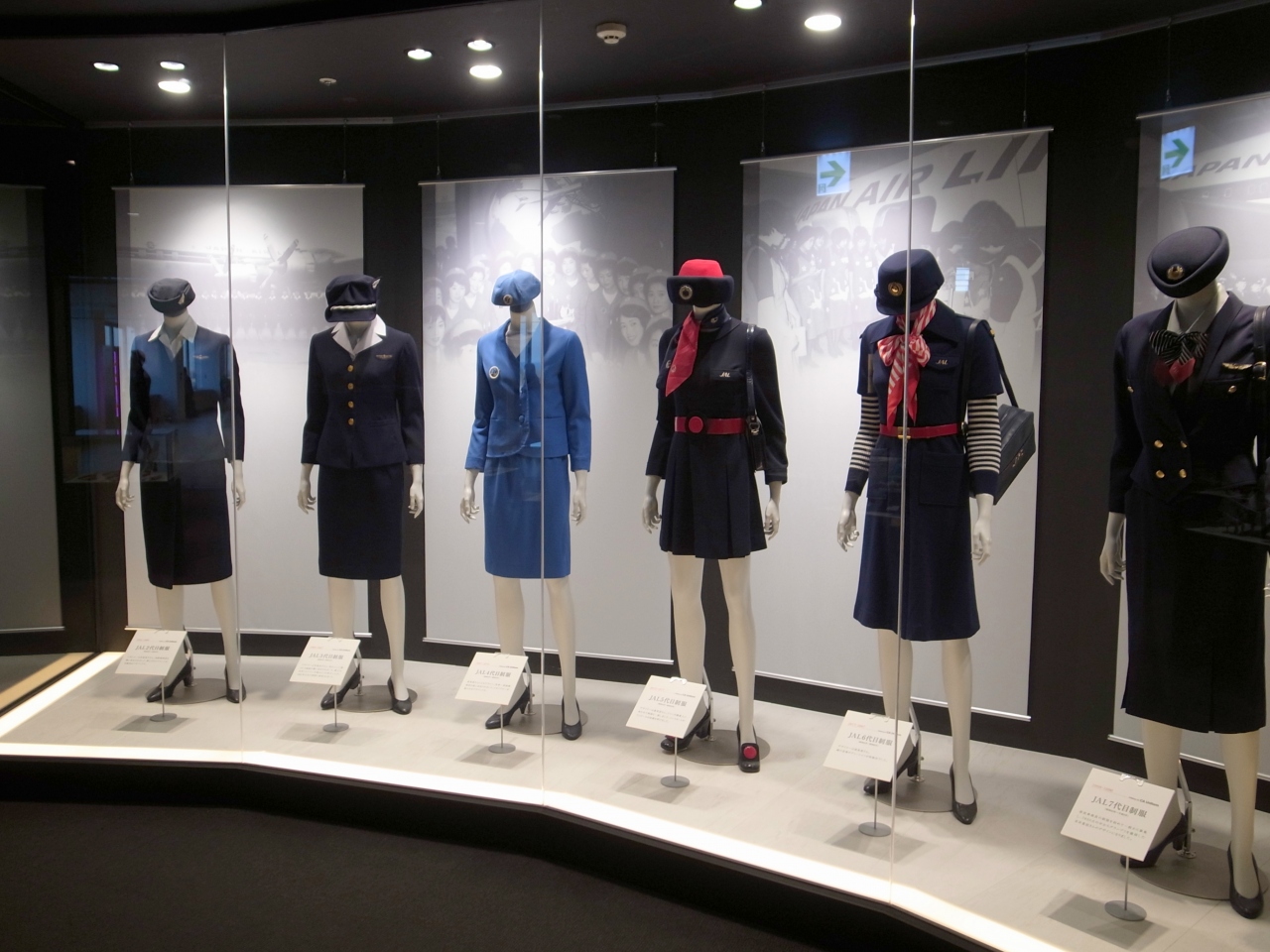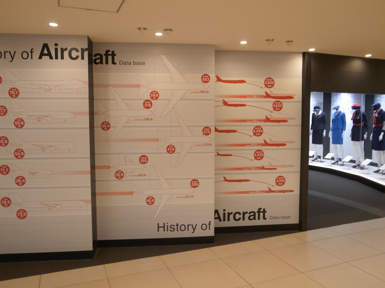 - 千歳の歴史。飛行機の航続距離。JALのCAの歴代の制服。バックなどの展示。