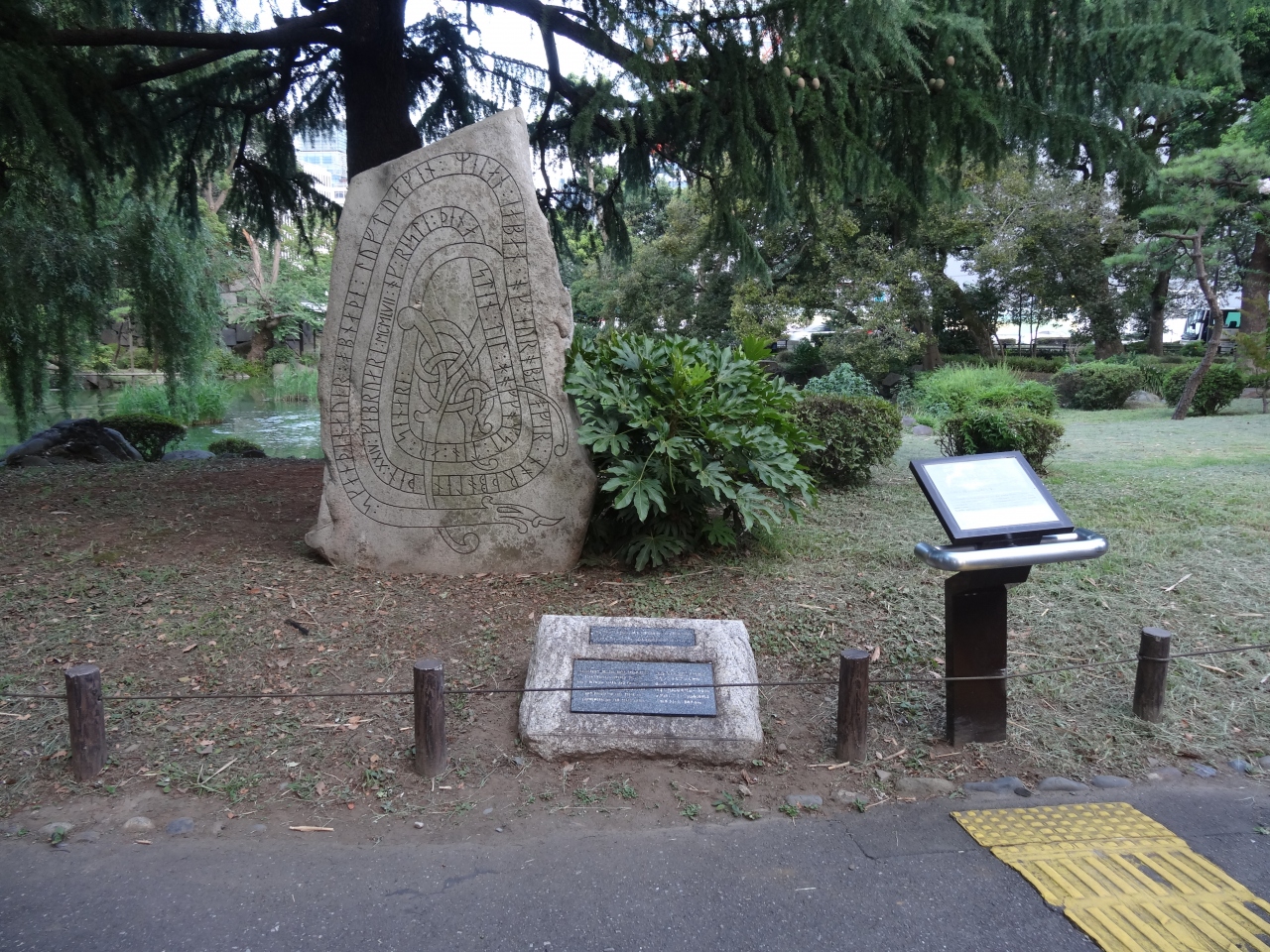 日比谷公園内にある石碑で、大きな石に古代スカンジナビア文字が記されています。日比谷公園内には南極の石などユニークなものが多いですが、これもその一つです。日比谷公園は都心のオアシスで休憩中のサラリーマンも多いですが、このような展示物を見ながらの散策も楽しいです。
