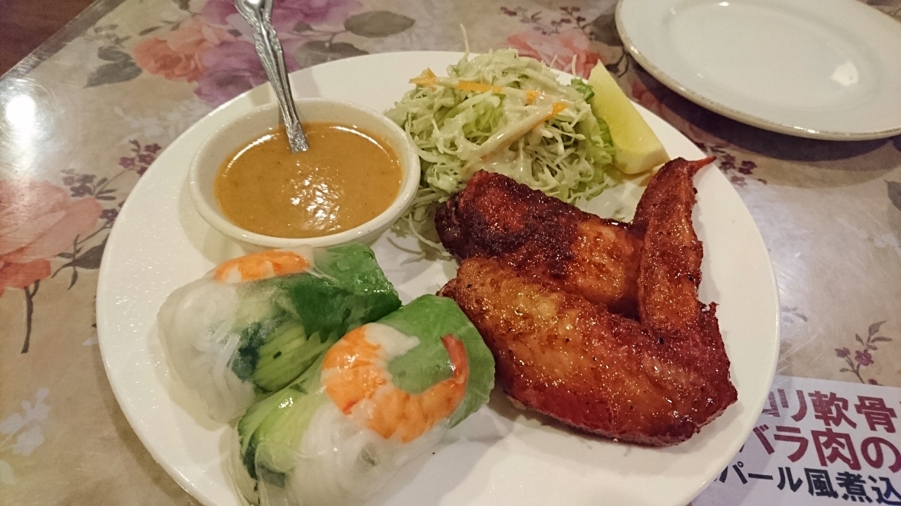 内容は、前菜盛り合わせ、チキンオーブン焼き、ベトナム生春巻、スープ、ピクルス、選べるカレー、ナンまたはライス、選べるアジア料理。