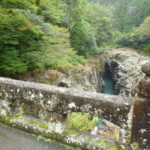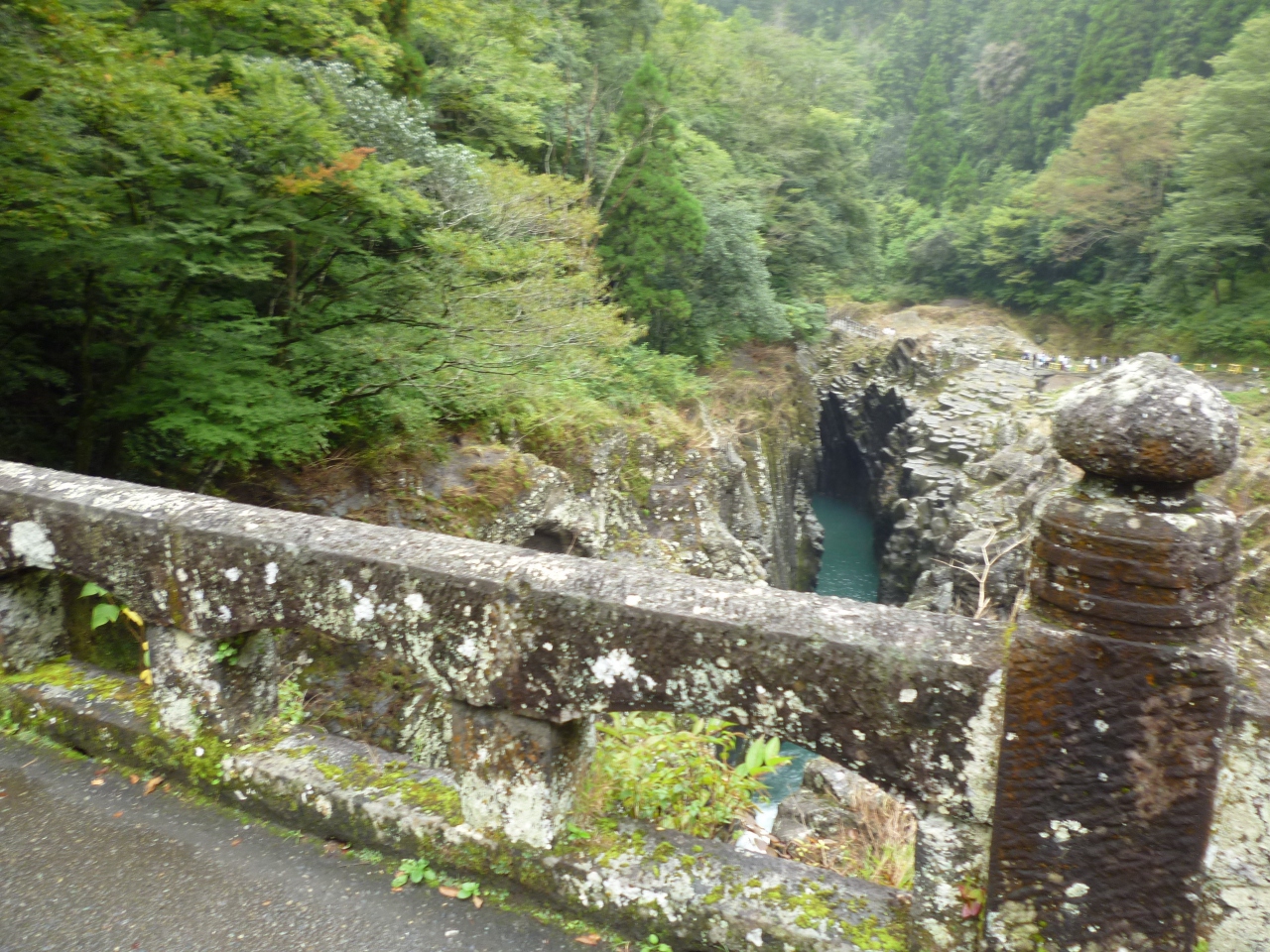 高千穂峡遊歩道入り口から、甌穴や神硯の岩を見ながら進んで行くと、石造りの風情のある橋を渡りました。下には五ヶ瀬川が切り立った山肌の間を流れ、自然の美しい風景です。記念撮影ポイントで、みんな写真を撮っていました。