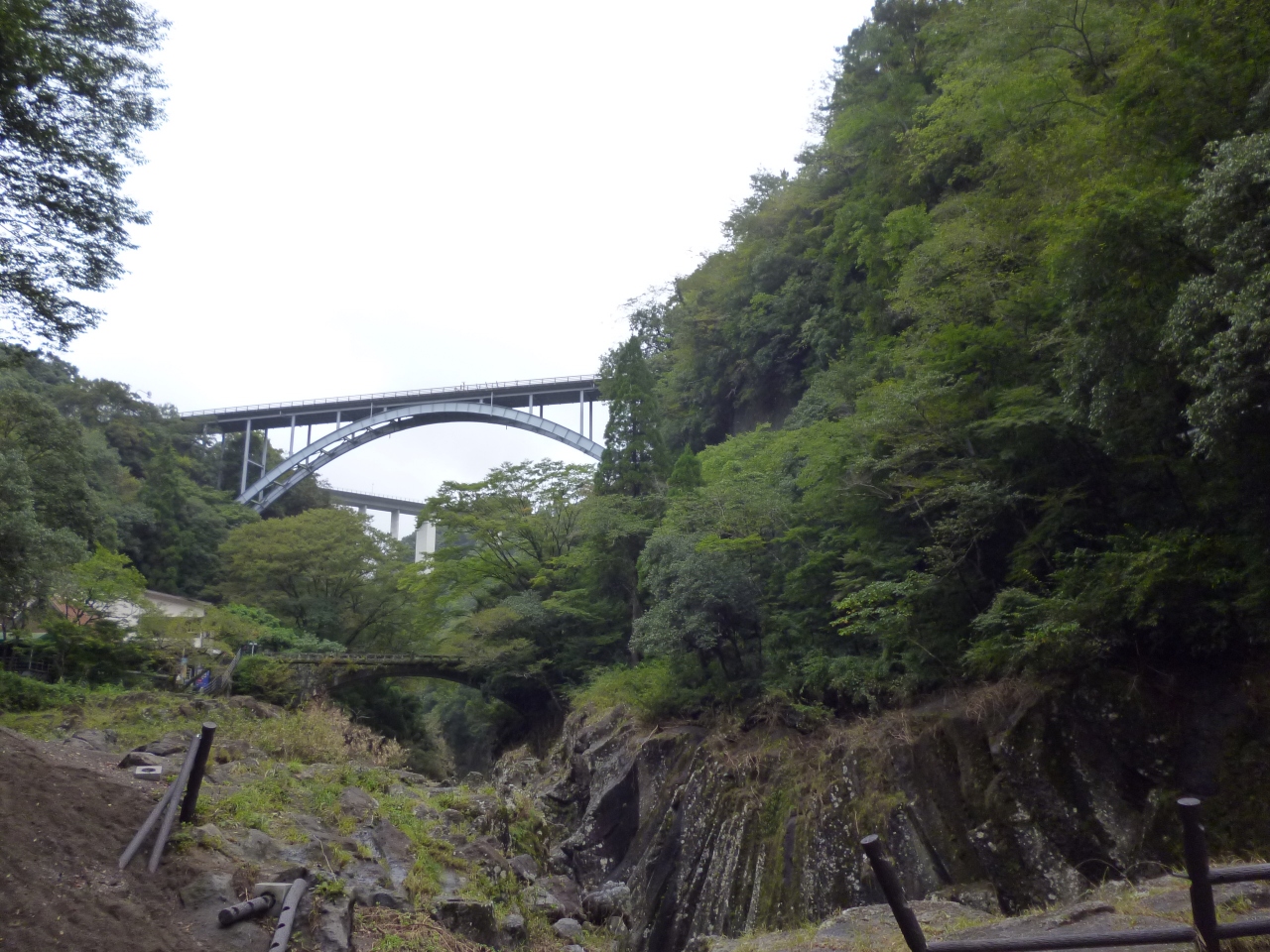 高千穂遊歩道から3つの橋が一緒に見える絶景スポットがありました。神都高千穂大橋は1番遠くにあるので小さく写っています。観光バスで橋を渡ると、大きくて立派な橋でした。平成時代に造られたコンコリートの新しい橋です。