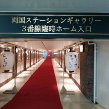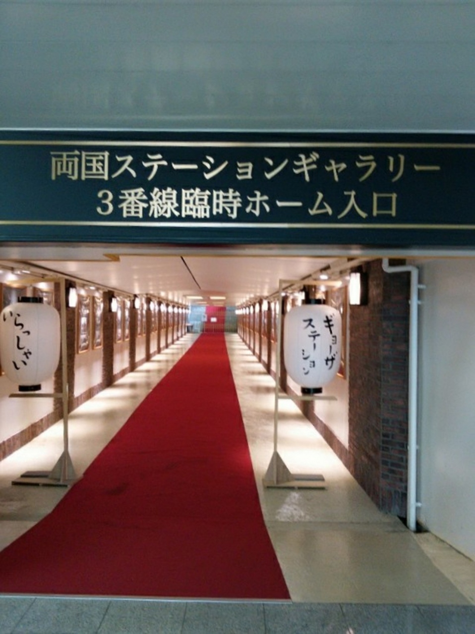 両国駅構内にあるギャラリーです。普段は使われていない3番線臨時ホームにつながる通路を利用したもので、通路にはレッドカーペットが敷かれているため、VIPなどが利用する特別な通路のような感じに見えます。ギャラリーには、両国駅の歴史などを知ることができる写真などが展示されているので両国駅に行ったら立ち寄ってみると良いです。