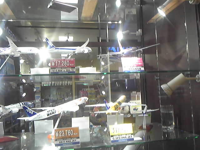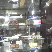 飛行機のミニチュアモデルや、関連グッズがたくさん置いてあって、