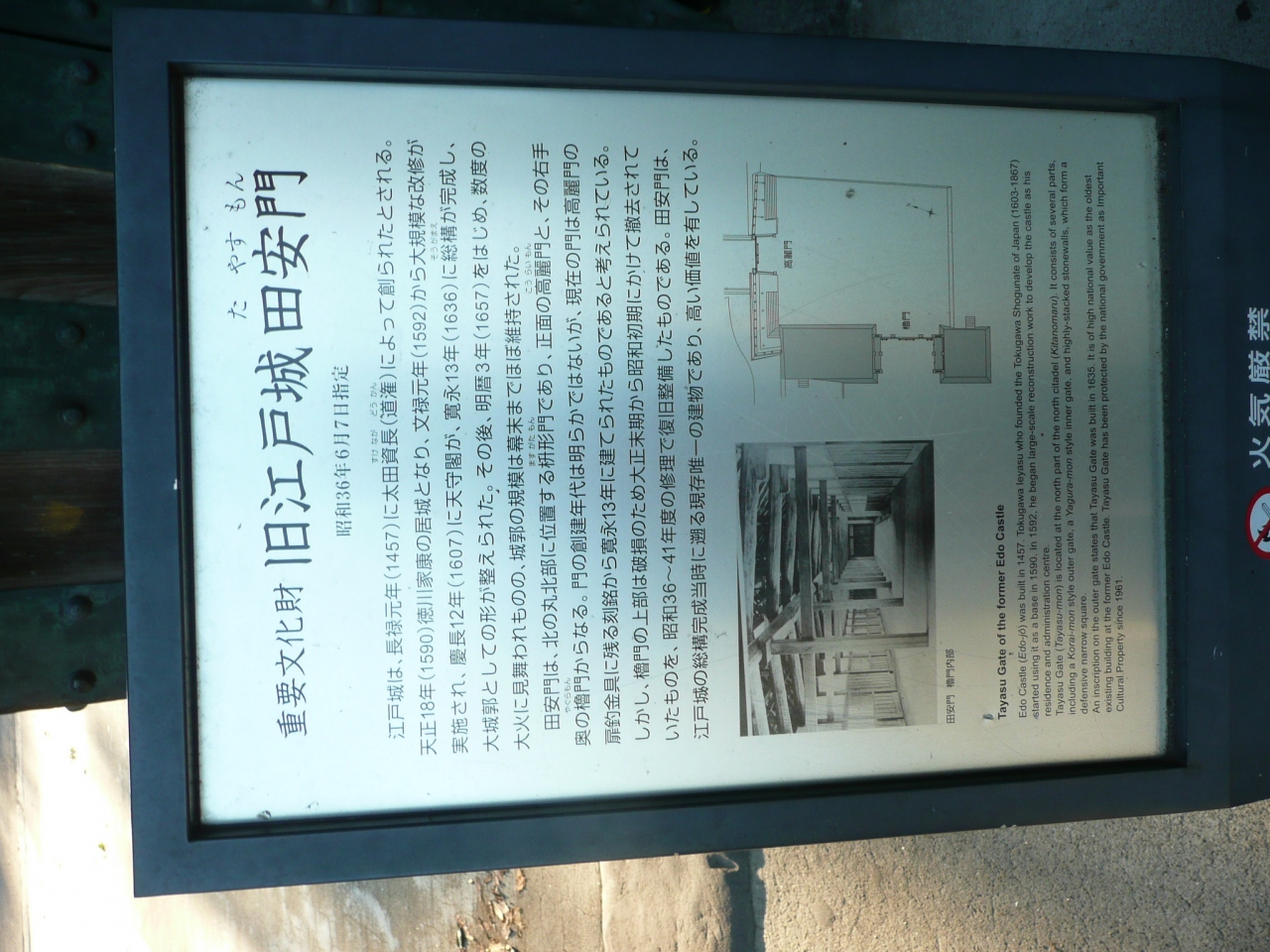地下鉄の九段下駅からインド大使館に向かう途中、北の丸公園の入口にこの門がありました。門の近くに設置された案内板によると、重要文化財“旧江戸城田安門”と記されていました。江戸城の総構完成(1936年)当時に遡る現存唯一の建物として貴重な価値があるそうです。