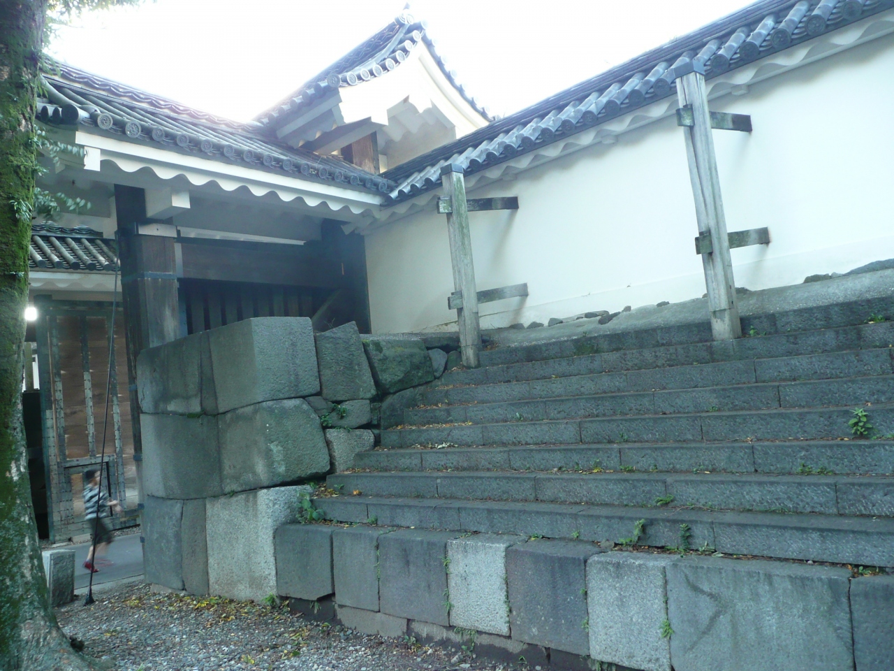 門の表側は、石垣の上に白壁が垂直に立っていますが、内側に回ると下部は石段が組み上げられており、白壁は支柱で補強され、戦に備えた堅固な構造となっていました。