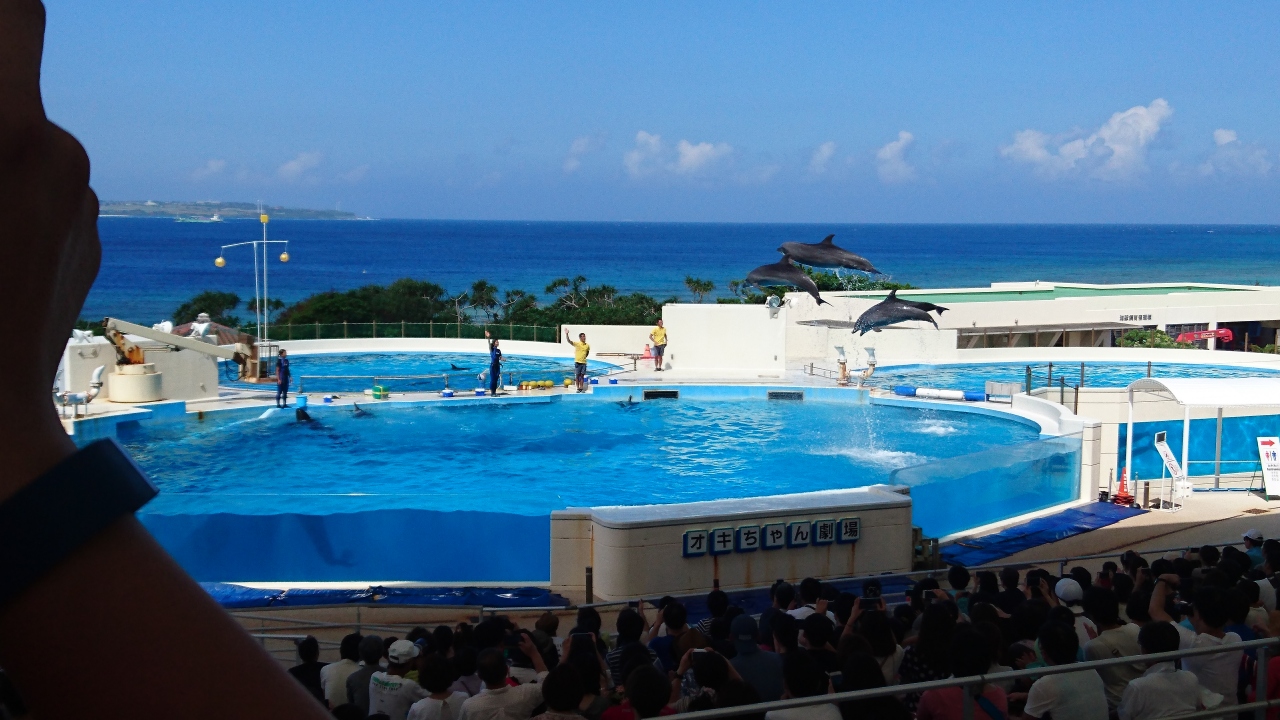 沖縄美ら海水族館を出て後に行ったのがオキちゃん劇場です。無料で見ることができますが、この日は日曜日だったので立ち見が出るほど超満員でした。イルカショーはイルカが挨拶するところから始まり、ジャンプをするなどのアクロバティックな技を見せて大盛り上がりしました。満員でしたが圧巻のイルカショーを見せてくれました。