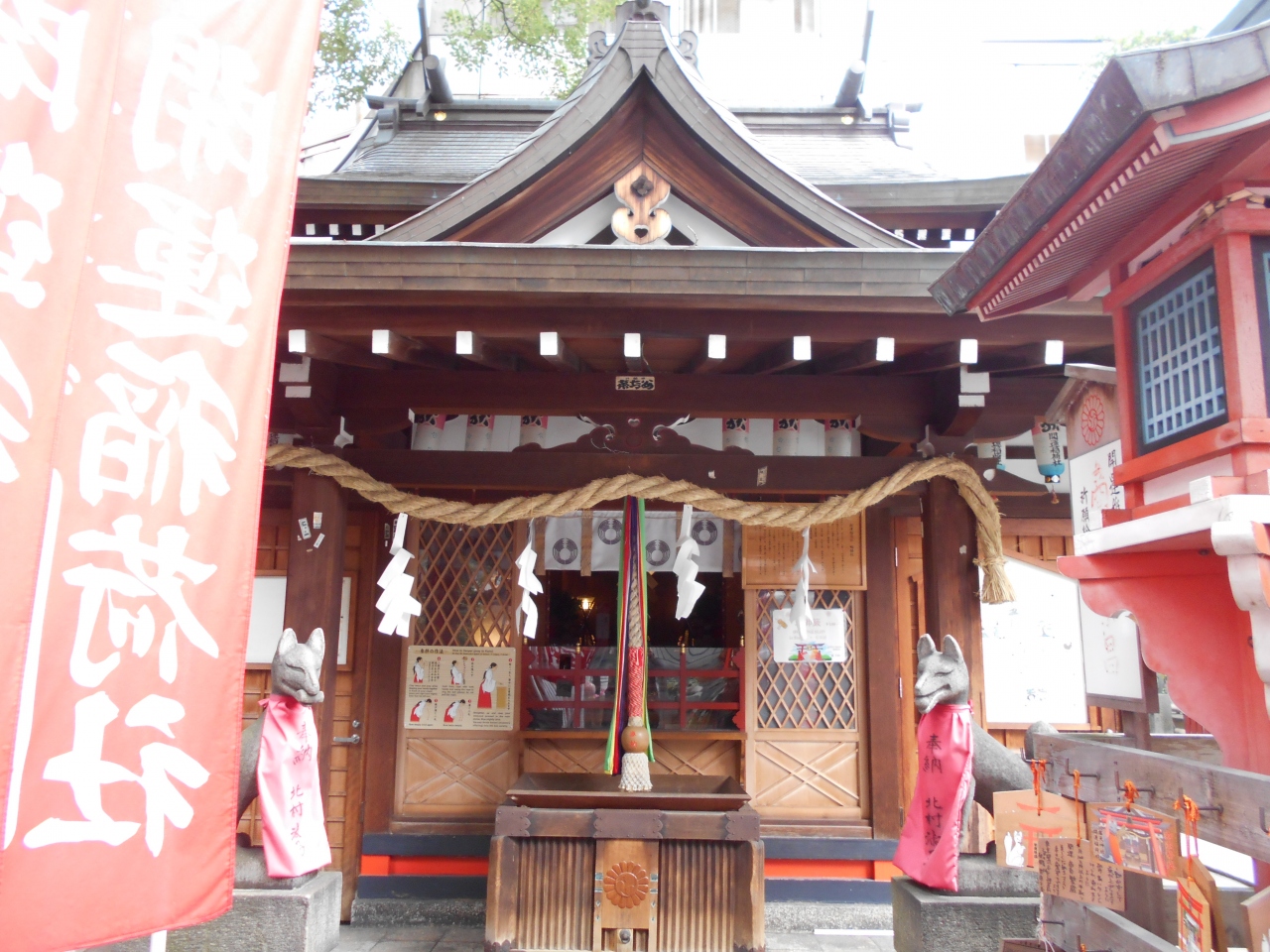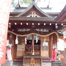 露天神社の境内の中にある末社です。おいなりさん(狐)は最初見ると少し怖いですが、よく見ると愛敬がある顔かも?。商売繁盛・五穀豊穣、皮膚病の治癒のご利益があるとされています。