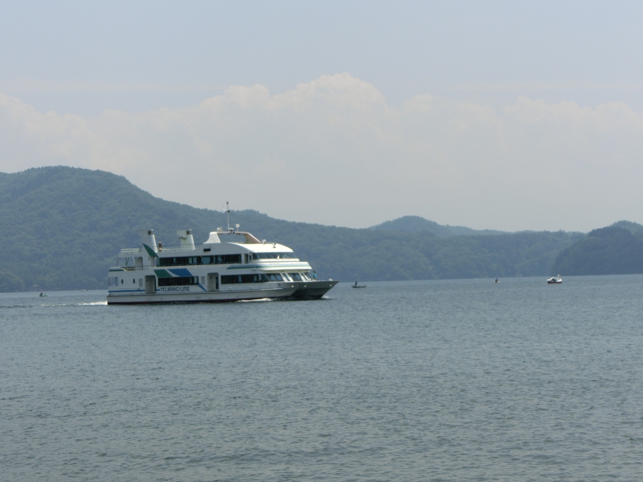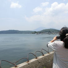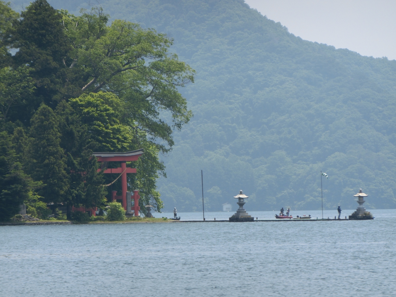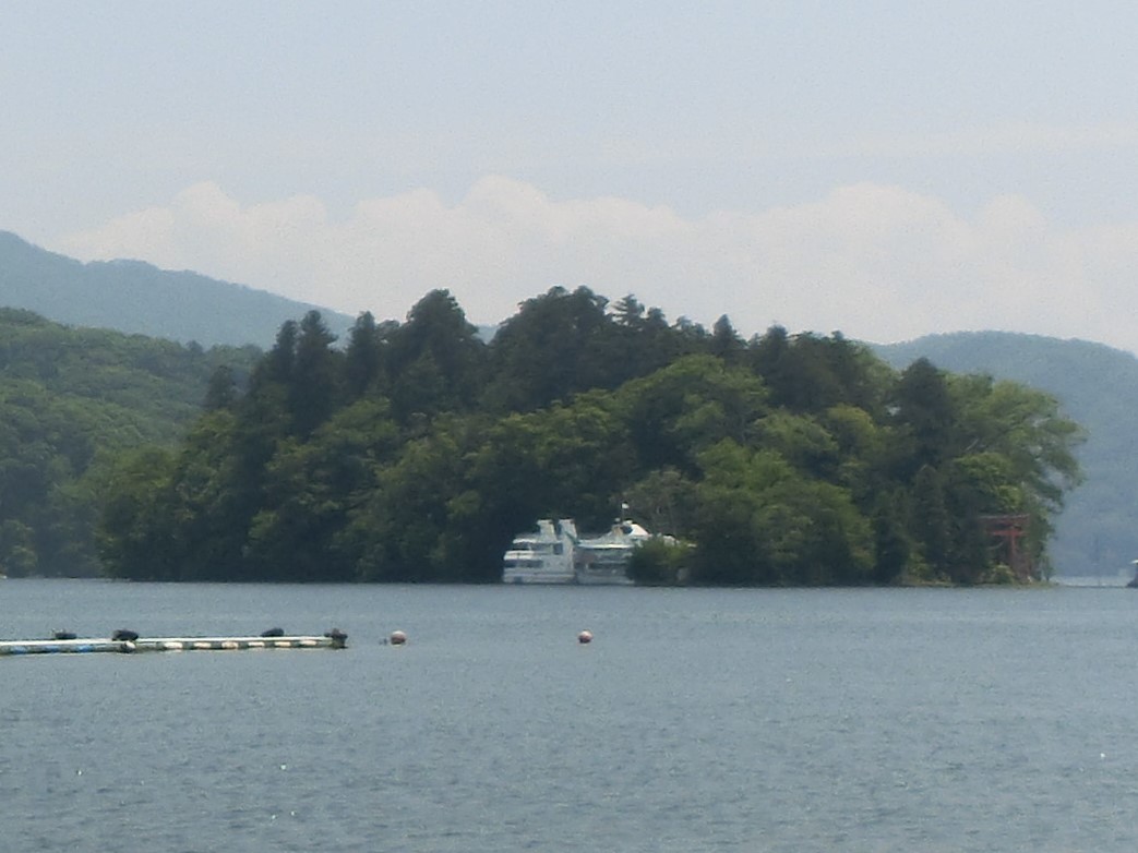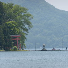 湖に小さな島が見えますが、これは琵琶島(弁天島)です。