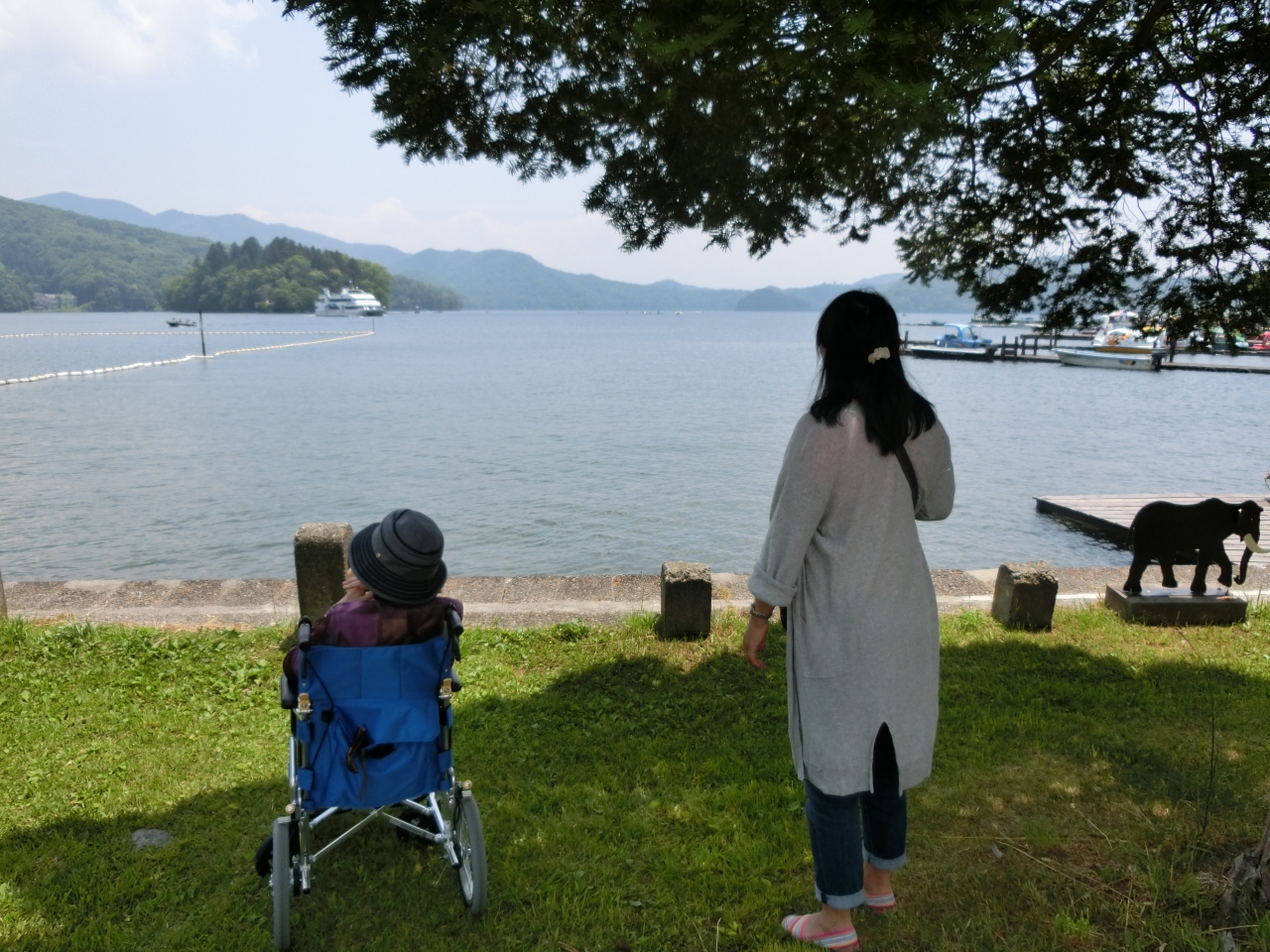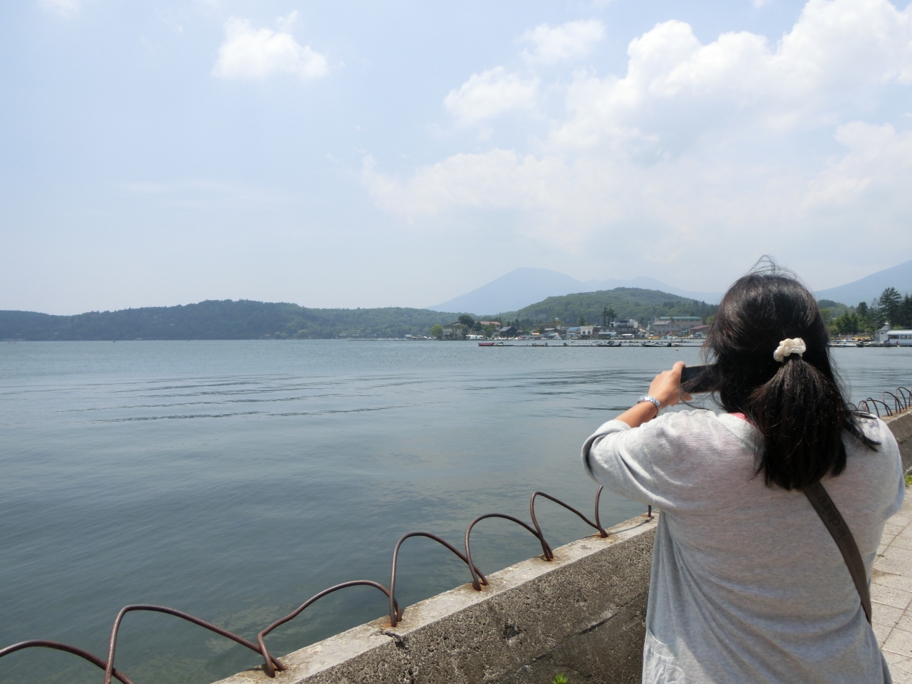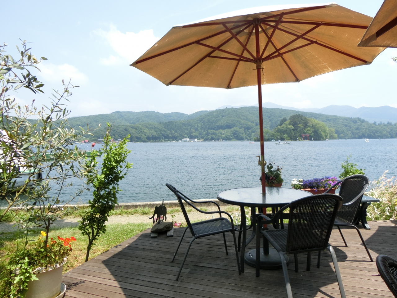 湖に小さな島が見えますが、これは琵琶島(弁天島)です。