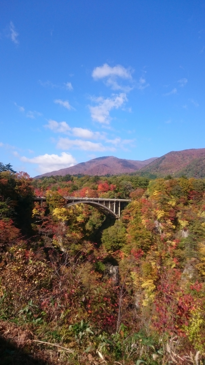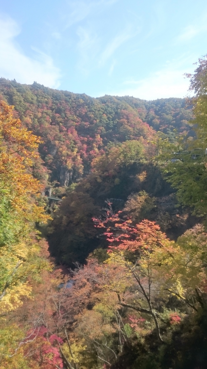 快晴の今日、行って来ました。真っ青な空に鮮やかな紅葉が映えて只今最高絶景❗昨日も快晴と天気予報だったので鳴子駅について直行午後2時には着いたのですが、思ったより良い天気にならず、曇り空。それでも渓谷は美しく紅葉して歓声が上がりました。それで十分だと思っていましたが、翌日は間違いなく快晴と天気予報だったので、電車の時間までもう一度行くことになりました。午前中太陽か渓谷に当たり青い空とにくっきり。昨日とは全く違う。絵はがきのような絶景でした。見頃にはもう一息の7割位だったのですが、タクシーの運転手さんがこのくらいが1番キレイだと私は思いますよと言っていました。全部が赤黄に染まるよりも一部に緑を残す位のグラデーションが紅葉を際立たせてキレイだと言う事でした。なるほどと思い今日これたことをしあわせに思いました。渓谷のトンネルを電車が通る時は橋の上は観光客のカメラがすごい。平日の今日でも車は渋滞するし、バスは遅れますから時間を十分取った方がよいです。