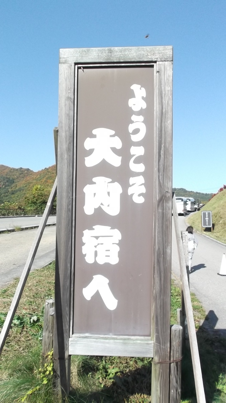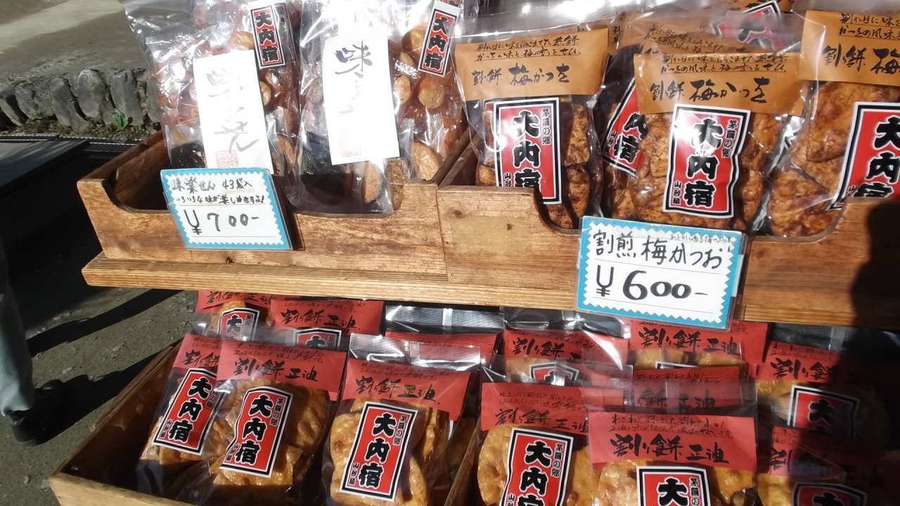 塔のへつり見学後車で移動(約30分程度)、温かい日差しを受けてゆったり宿場町を見学できました。ゆんびりした雰囲気で茅葺屋根のお店の名物を巡れました。