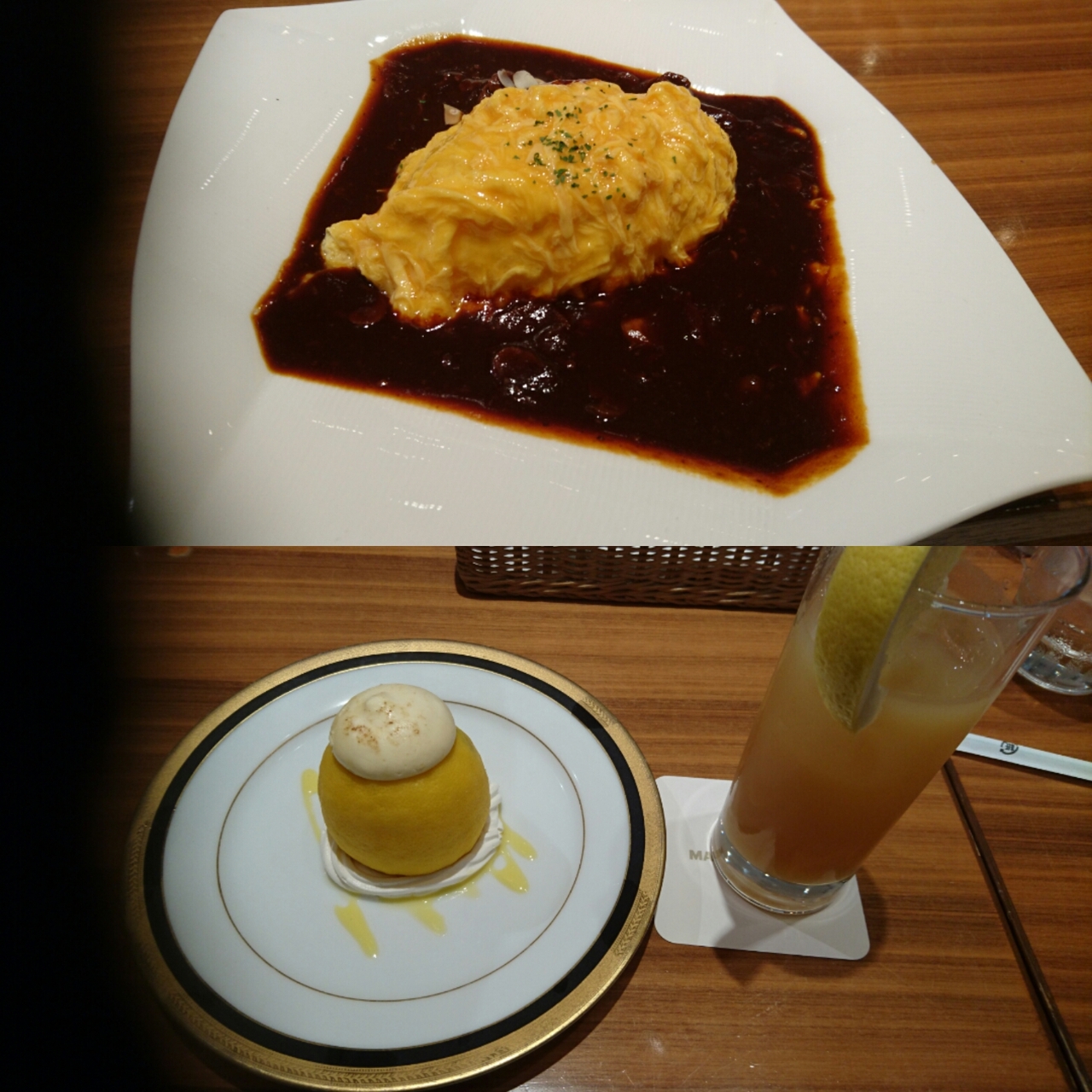 オムライスタイプの二種類のルーがかかったハヤシライスとレモンのデザートを。