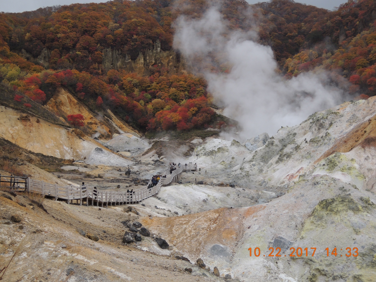 10月22日に訪れました。今年は紅葉が例年より少し早いそうですが、ちょうど紅葉の真っ盛りで見事!の一言に尽きると思いました。紅葉と湯煙と白と黄色の地肌とがマッチして本当に美しかったです。