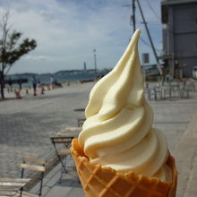 お土産や地域の特産品がありました。門司港レトロカフェがあり、外側にテイクアウトコーナーがありました。名物バナナソフトをテイクアウトしました。色がほんのりとバナナ色です。ジェラートっぽくてすっきりとした味でおいしかったです。