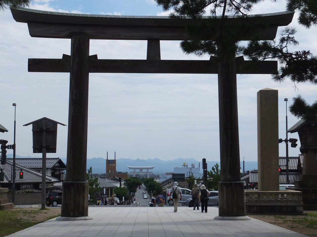 さて、この神門通りをきれいに見渡せる場所があります。出雲大社の境内入り口の勢溜の鳥居(ニの鳥居)からの眺めです。この場所は一段高いところにあるので一の鳥居まできれいに見通すことができるのです。