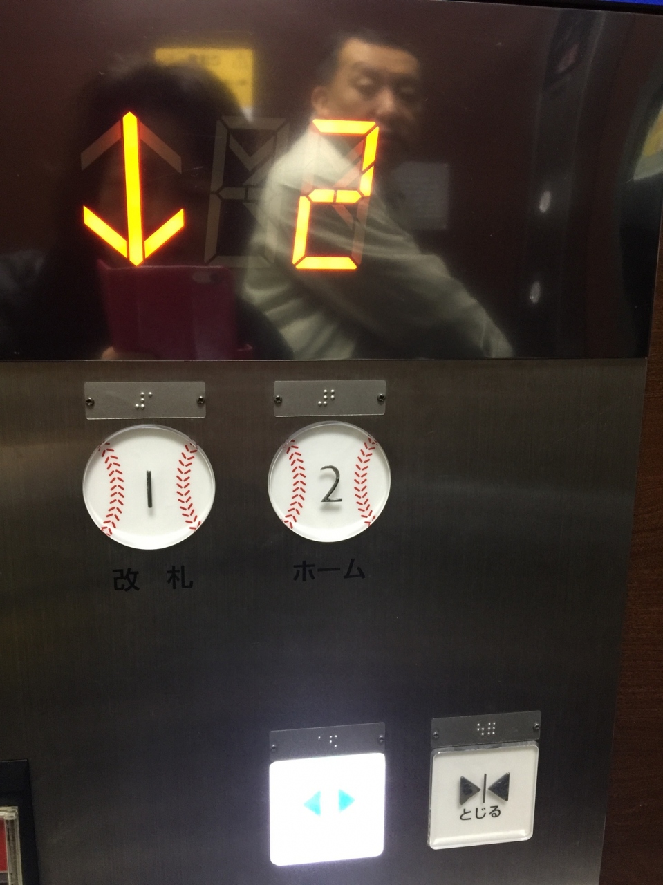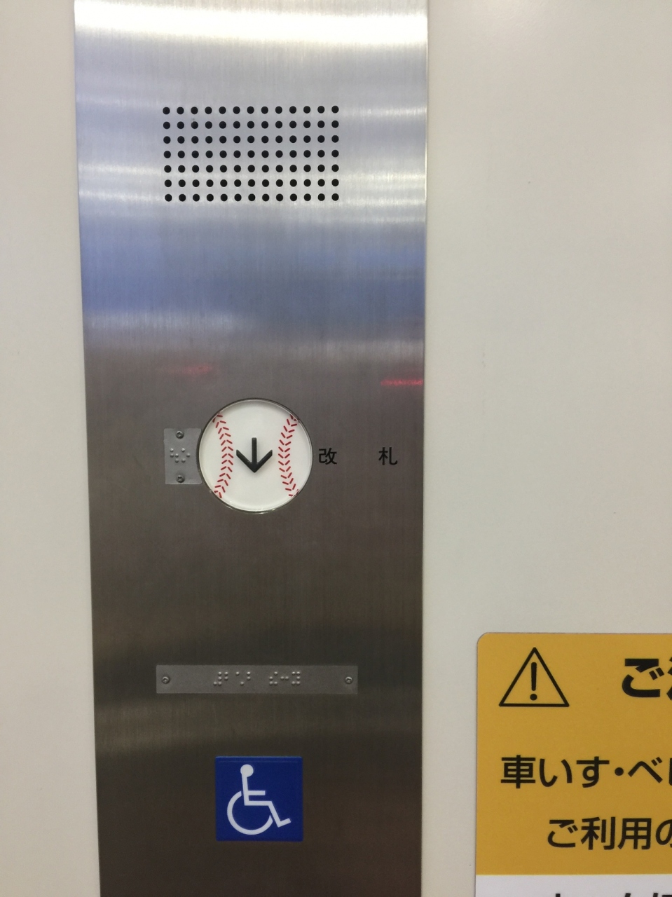 阪神甲子園駅のエレベーターがあまりに可愛いくて、つい写メしました。エレベーターの外側にある1階、2階を押すボタンが野球のボールになっていました。エレベーターの中の1階、2階を押すボタンも同じくボールの絵になっていました。以前からエレベーターのボタンがボールだったかどうか定かではないですが、エレベーターも駅が綺麗になったと共に、きれいなエレベーターになってました。