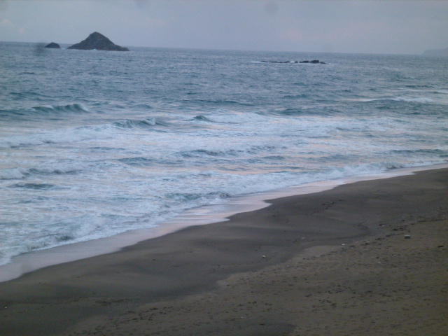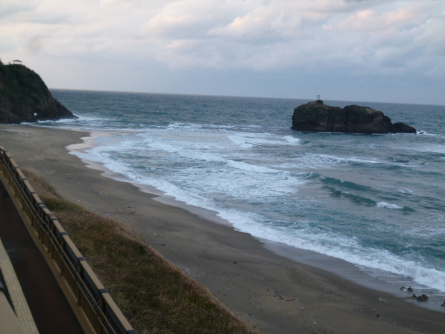 また弓なりの白い砂浜は波も穏やかでシーズンオフということもあって人気も無く静かでした。ハイシーズンには海の家なども設置され賑わいをみせるそうです。日没の夕日が綺麗でした。