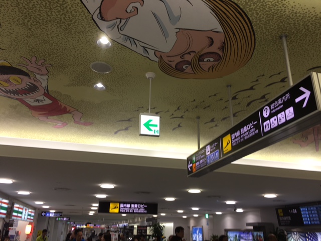 境港観光のために羽田からANA便で到着しました。小さな地方の空港です。名前に鬼太郎が付いているだけあって、あちこちにゲゲゲの鬼太郎に関係するキャラクターなどで溢れていました。バス停の前の警察署でさえ、ゲゲゲの鬼太郎でした。