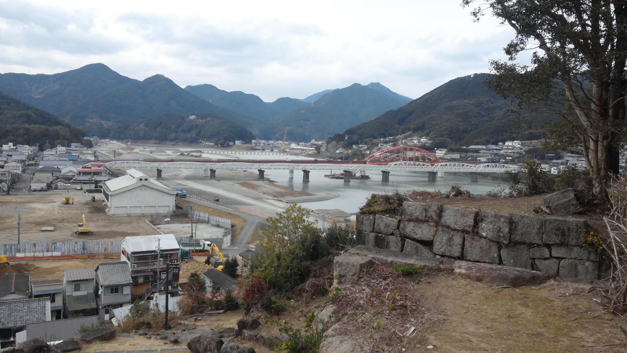 公園に行くのために少し高い位置を歩くことは難しくないです。和歌山県と三重県の川の上の素晴らしい橋を一望できます。冬の日に残りの石垣の上に、いくつの工事が進んだから、未来もっと現代の風景があるかもしれません。