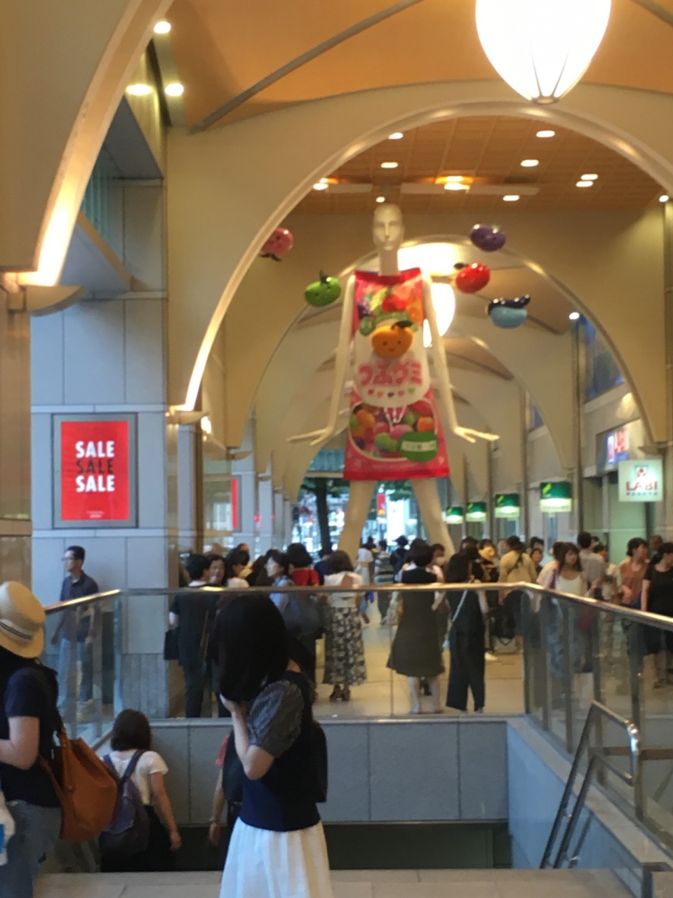 名古屋ひとり旅の際に気になっていたナナちゃん人形へ行ってきました。なにやら季節に応じてきている服装も変化するという事。さぞ目立つ場所にあるのかと思いましたが、JR名古屋駅からはかなり迷いました。近鉄と名鉄の間の通路にありますが、名古屋駅が広大なためJRや新幹線で来た人はまず迷います。そこまで道案内も多くありません。行った日の服装は何故かグミのPR服装でした。