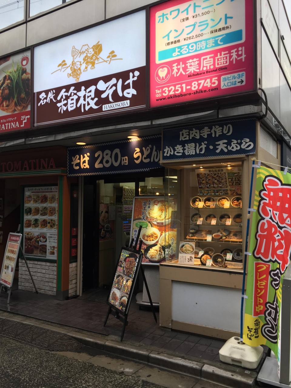 秋葉原の昭和通り口を出た正面にあります。こちら側は、電気街とはまた違った雰囲気で、立ち食いそば店がよく似合います。ここはチェーン展開している、その立ち食いそば店。味はさして代わり映えしませんが、かけそばが280円とリーブナブルな価格設定。財布似合います優しいし、これが気に入ってます。サラリーマンの利用率も高め、の印象です。