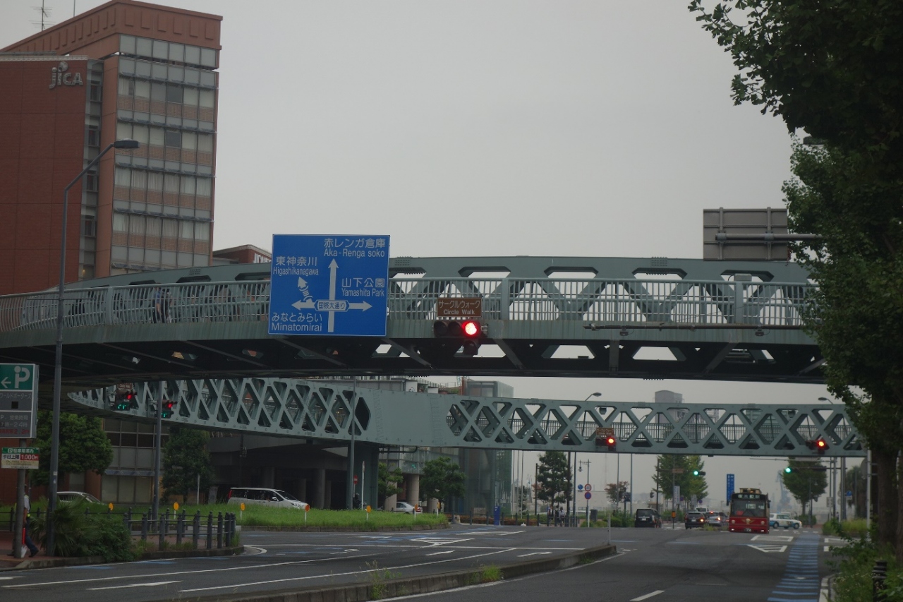 ワールドポーターズから歩いて赤レンガ倉庫方向へ向かう途中にこちらのサークルウォークに出会いました。国際通りと万国橋通りの交差点を囲むように円形の歩道橋が架かっています。近未来を感じさせるデザインで宇宙船のような印象でした。