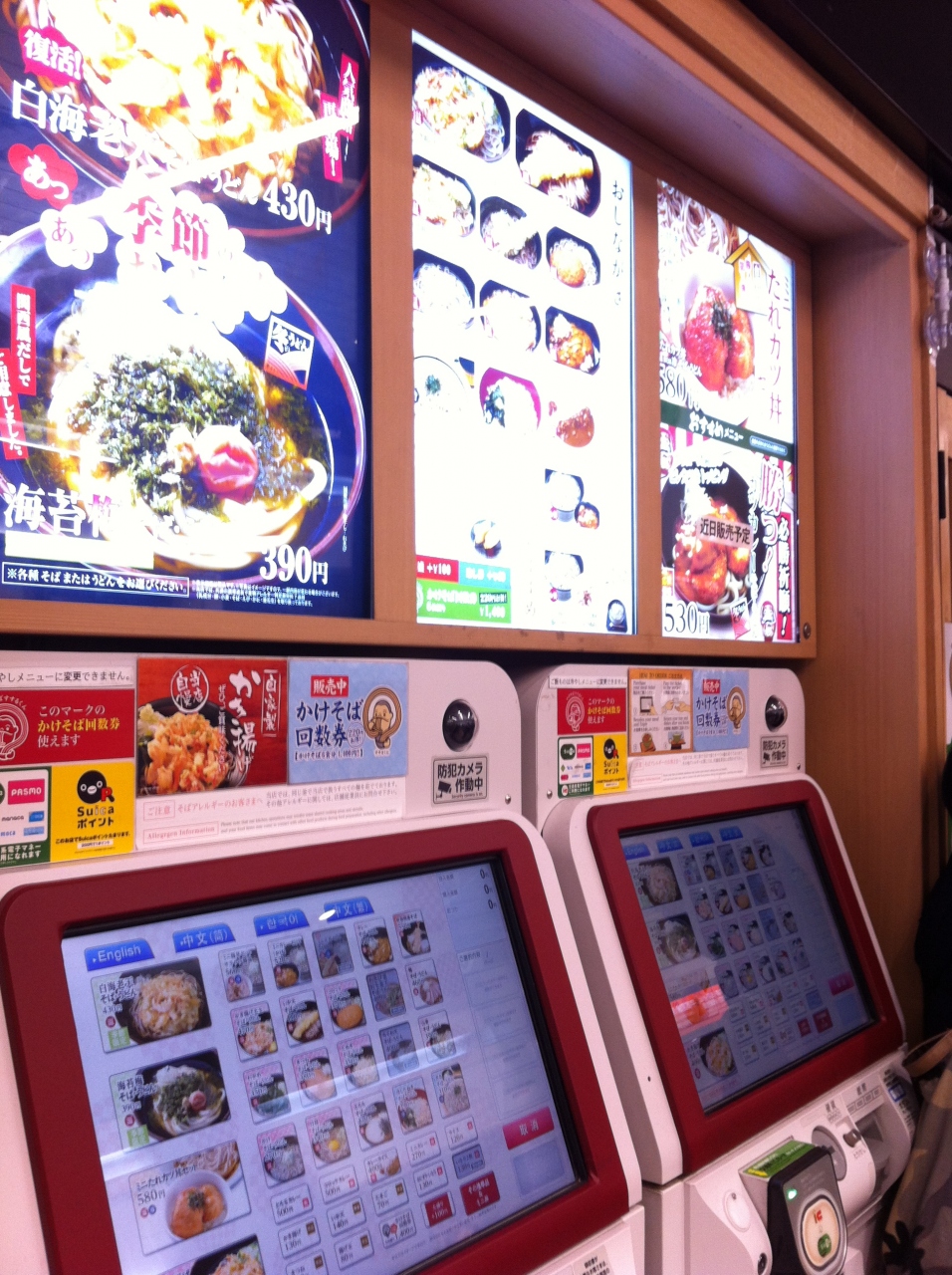 改札内にあるので、いちいち降りてルミネなどの商業施設でしっかり食べるなくても良いときには、日本が誇るファストフードそば・うどんをここでいただきます。タッチパネル式の券売機になって、スイカも利用できるとあって、すばやく発券でき効率的です。ただ、ラッシュ時には、いろいろと悩んでしまい渋滞を作る可能性もあって決断の速さを求められることがあります。キメ打ちで望むようにしたほうがよいかもしれません。