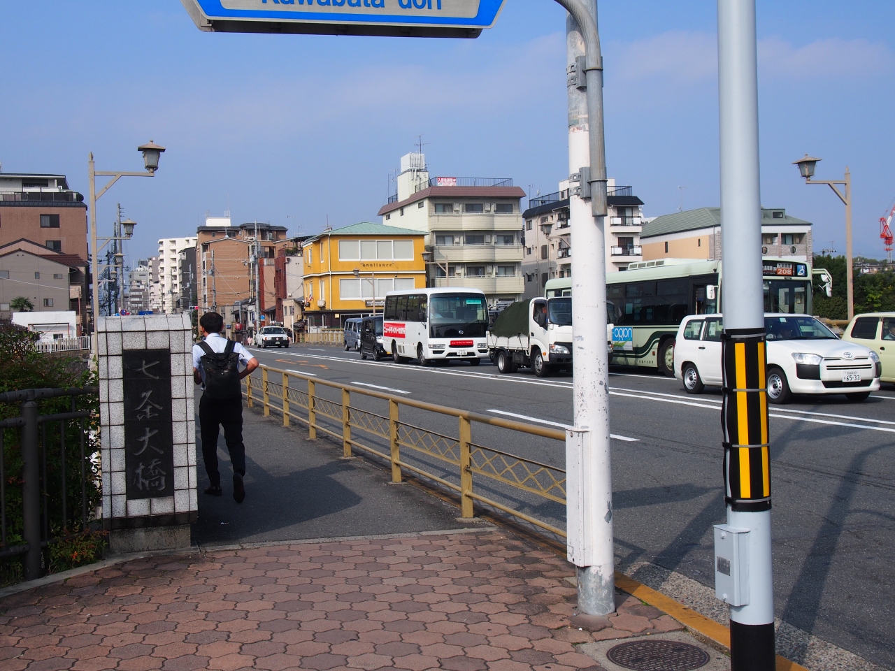 京都駅から国立京都博物館、三十三間堂へと歩いて行きました。ちょうど途中にある鴨川にかかる七条大橋を渡りました。橋自体は特段、目を引くようなものはありませんでした。橋の幅は広く、交通量も多い橋です。七条大橋の橋のちょうど真ん中からの北側の眺めは、五条大橋、四条大橋などがよく見えていい眺めです。川沿いの遊歩道もいい眺めです。京都は橋を渡ることも楽しいです。