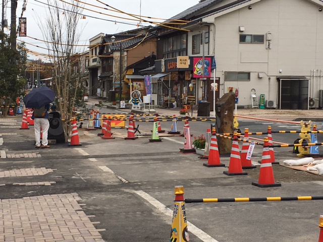 JRの境港駅から水木しげる記念館まで続く道です。ほどのあちこちに妖怪の銅像などがあり、雰囲気を盛り上げていますが、ちょうど改装工事の真っ最中で、あちこちに工事用の柵やコーンが置いてあり、景色としては台無しでした。道沿いのお店もゲゲゲの鬼太郎にあやかるお店が多くて、水木しげるワールドでした。