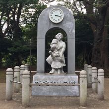 子どもを抱いたお母さんと空を指さす女の子の像の上に時計があります。