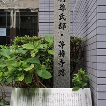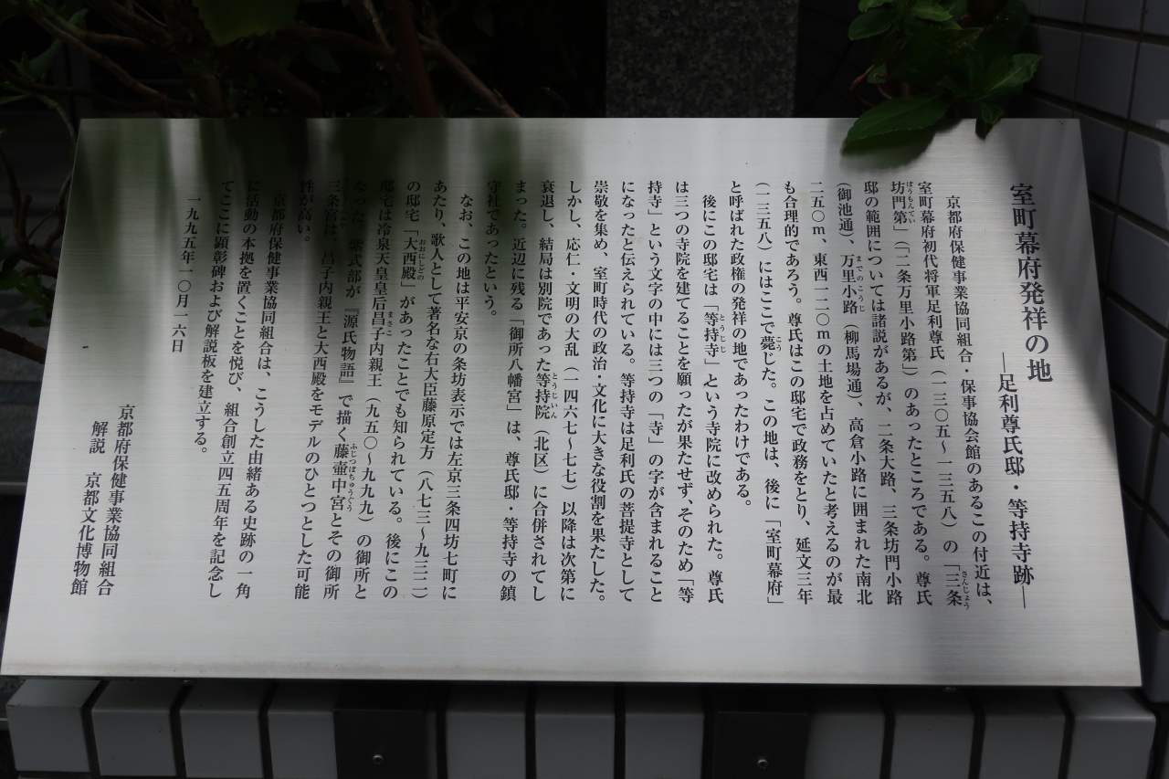 御池通りから高倉通りを上がった東側に足利尊氏邸・等持寺跡があります。京都府保険事業協同組合会館の入口右手の狭い植え込みの中に石碑と説明版があるのですが、地図だけ見ていっても非常に場所が分かり辛いです。周囲を探し回ってやっと見つけた程です。