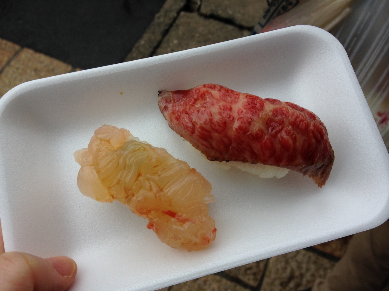 お店の外にちょっとした屋台のスペースがあり、松坂牛のにぎりを一貫から買えてその場で食べられます。松坂牛と伊勢エビのにぎりをそれぞれ食べました。上品な味で美味しかった。いろんなお店でちょっとずつ食べ歩きが出来るのがおかげ横丁の楽しみです。