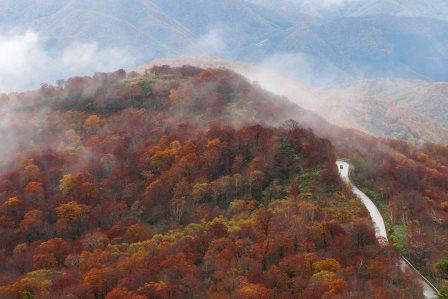 ここから目を地平近くに向けると遠くに見える猪苗代湖も見事ですけれど、もっと手前、足元の山の尾根を分けるように延びるレークラインもまた見物でした。阿蘇の「ラピュタの道」を思わせるような光景です。天気が悪くて少々クサっていたのですが、すると雲が低いところを流れていて、紅葉を分ける道が現れては消え現れては消え。望外に良い景色を見せてもらいました。
