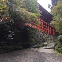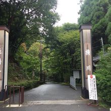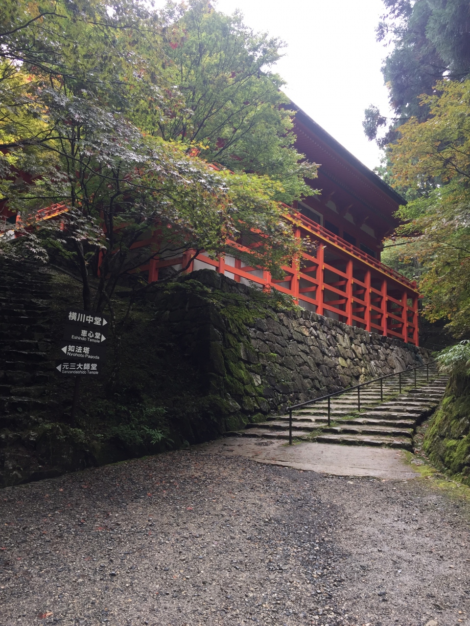 駐車場から横川中堂まで軽い下り坂になっていて、突き当たりを見上げると横川中堂のお堂を下から見上げる形になります。