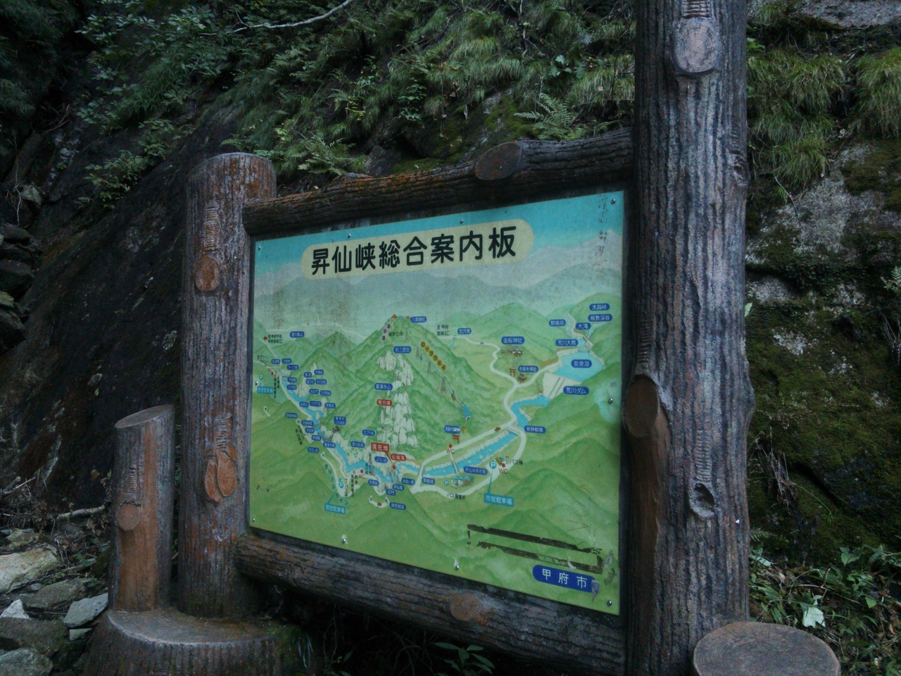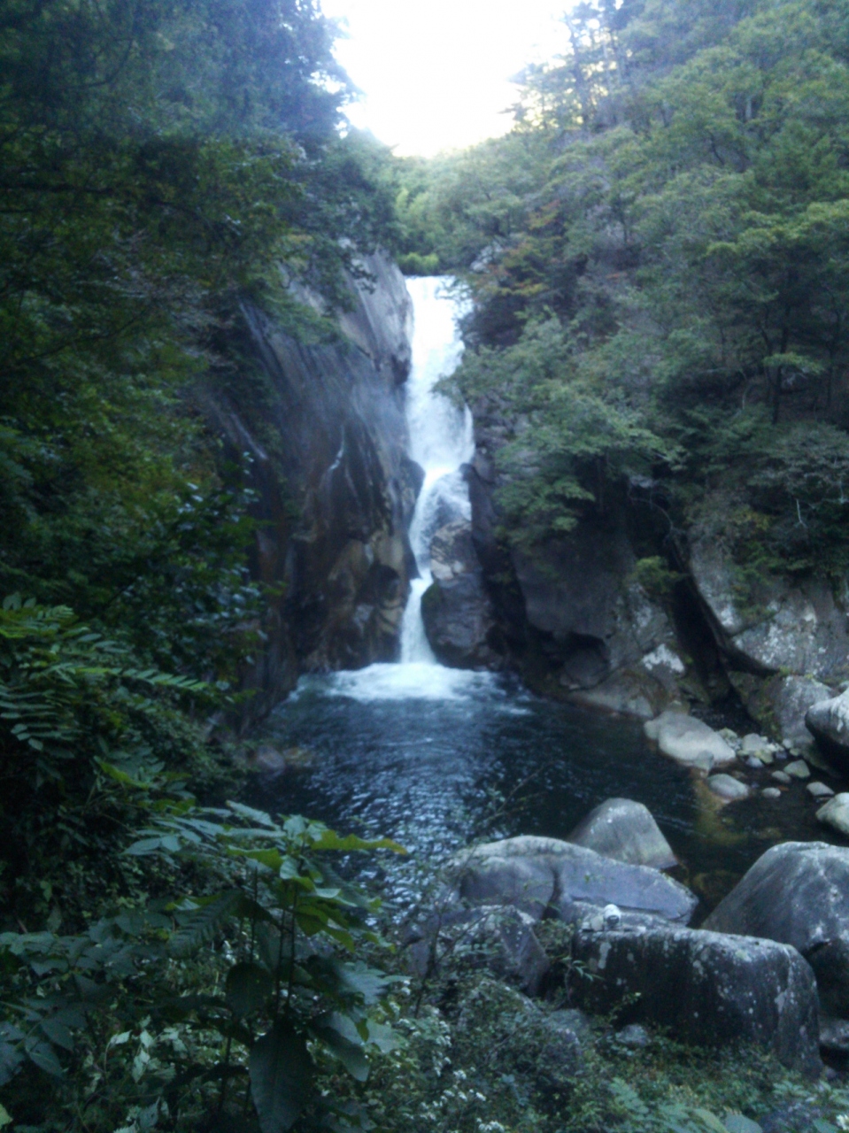 昇仙峡の散策路の途中にある大きな滝が『仙娥滝』です。森林の緑の中に落ちる水量豊富な滝でした。ちょっと薄暗く神秘的で、マイナスイオンたっぷりといった感じ。