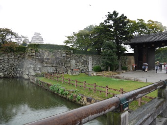 姫路城の内濠に新しく架けられた桜門橋の先に有る門が大手門です。橋を渡ったところに案内板が有り読んで見ると橋は平成19年に架けられ大手門は昭和13年に造られた門と有る、また門の形や大きさは当時の物とは全く違うとの事ですが、それなりに見応えも充分有ります。