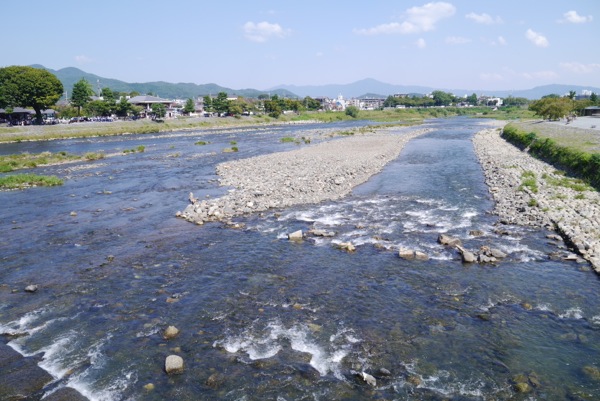 嵐山についてすぐに目に入ってくる景色のひとつです。渡月橋から川上の山々のほうを見るのもいいけれど、川下にはまたべつの景色が広がっています。川べりではハトたちがのんびりと昼下がりのまどろみを楽しんでおり、あまり人も警戒していない様子でした。かわいらしいハトを見る事ができるスポットのひとつとしてもおすすめです。