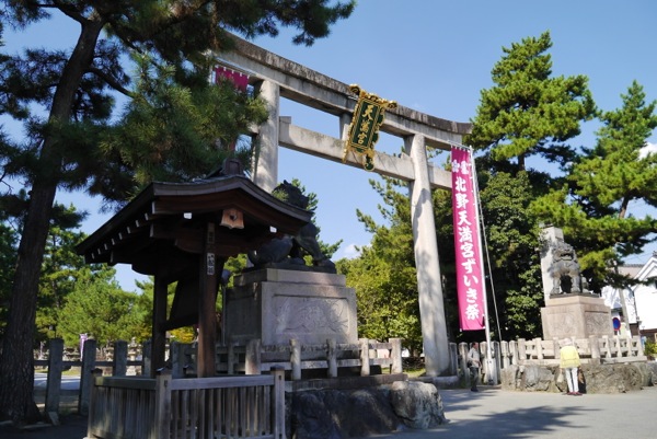 北野天満宮へお参りするときに、まずくぐることとなるのがこの鳥居です。じつに見事で立派な鳥居。鳥居の真ん中に掲げられている“天満宮”の文字も金色で、なんだかご利益ありそうです。鳥居だけに見入ってしまいそうですが、その脇にいる狛犬も、鳥居に負けず劣らずスケール感のある狛犬なので、ぜひ見逃さないでください。