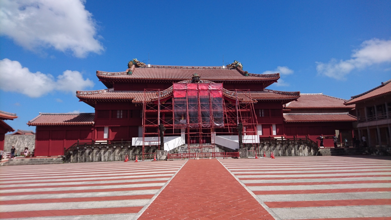 首里城の有料区域内に入ったときに最初に来たのが御庭です。御庭の白色と朱色のストライプの床がとても印象的でした。このストライプの床は琉球独特のもので、様々な儀式が行われたり、配列の目安にしていたそうです。