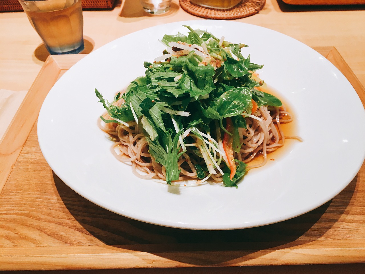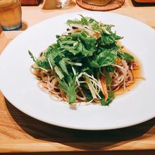 野菜がたっぷり乗ったサラダ風の蕎麦は、お好みでオリーブオイルを勧められました。しかしこれが意外と合う!美味し~。新発見でした。