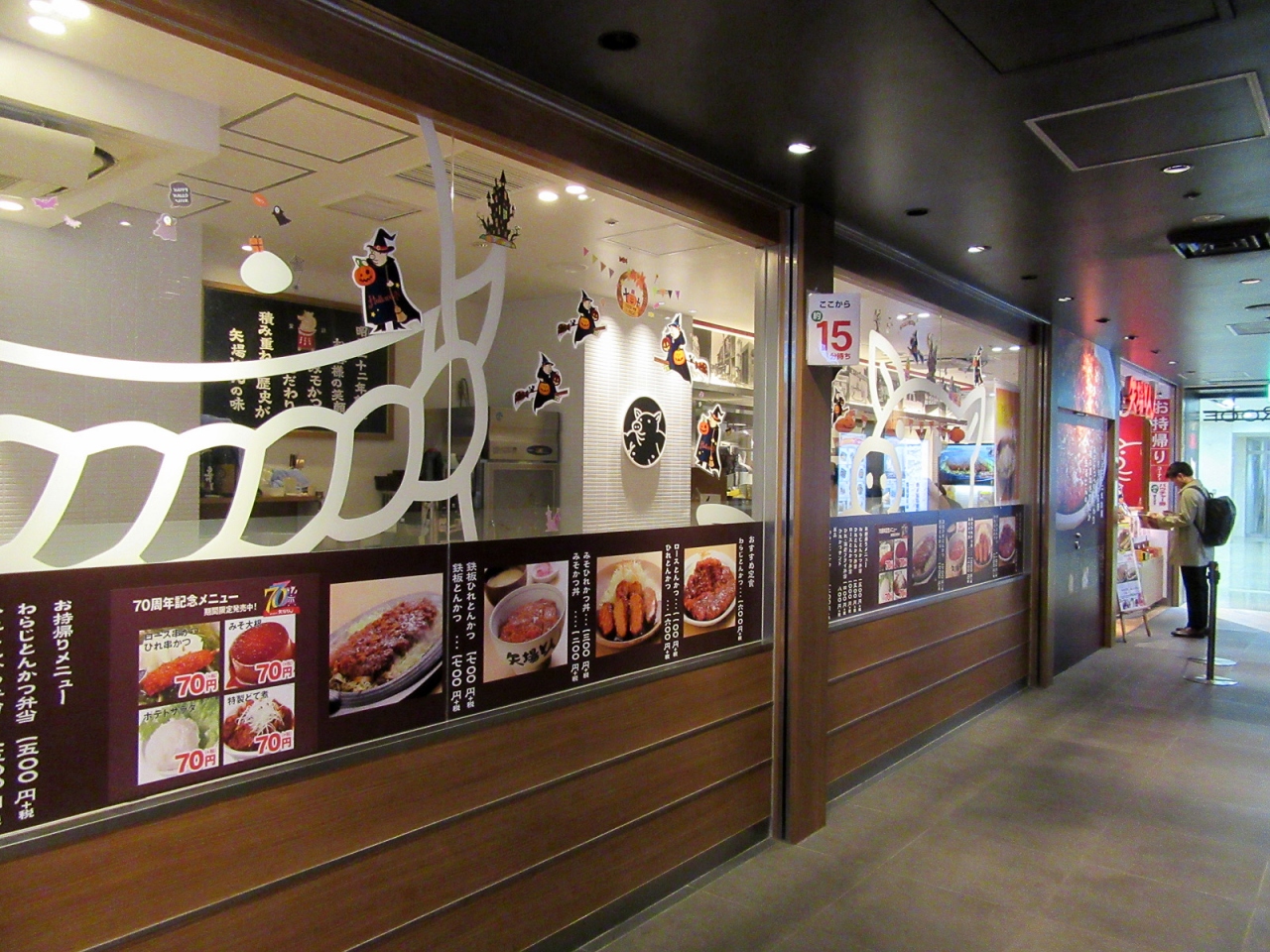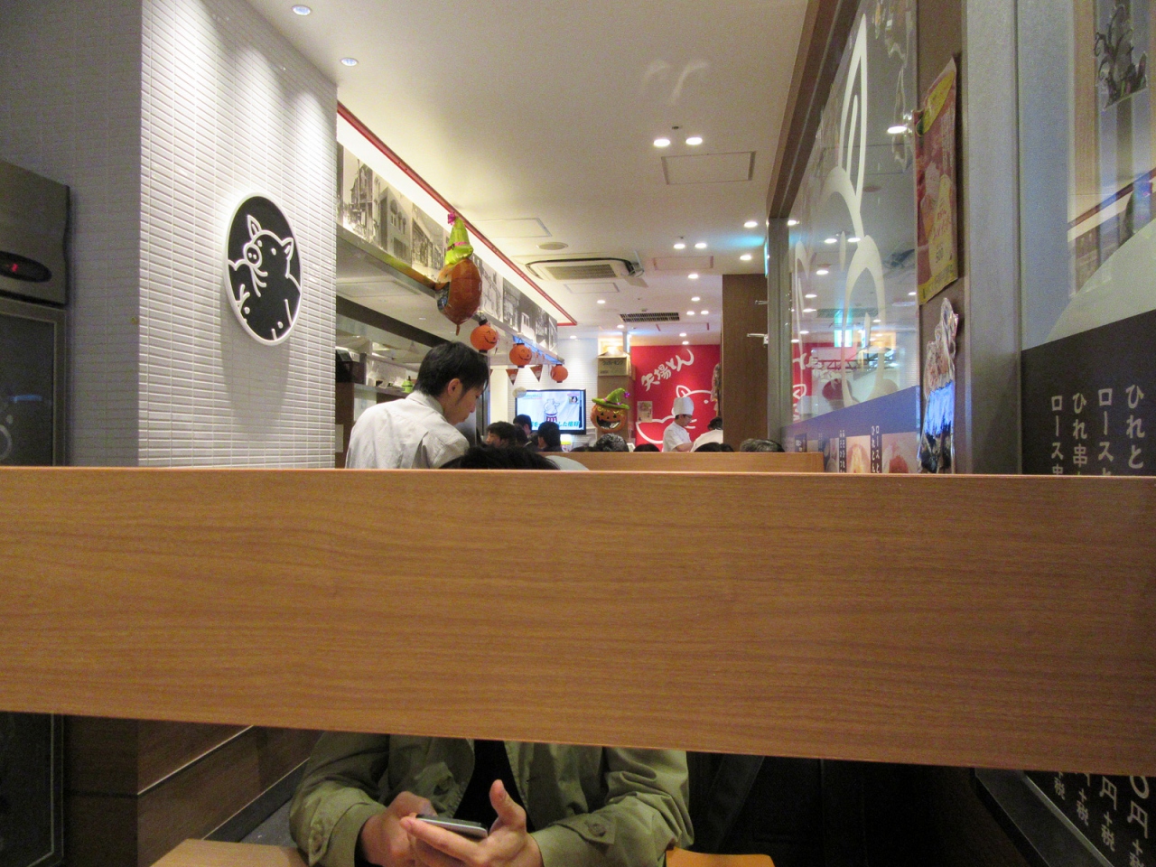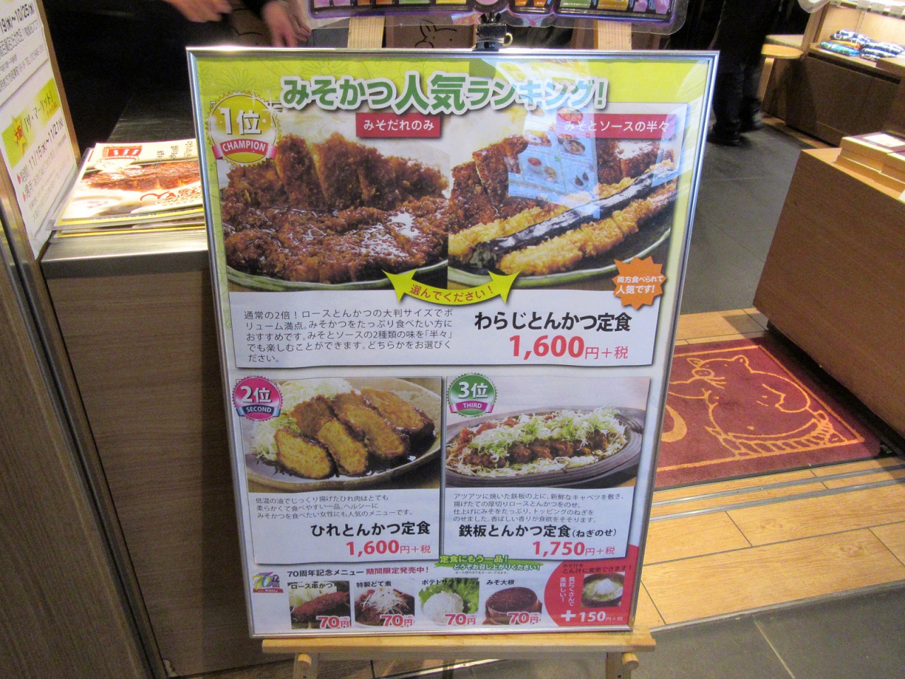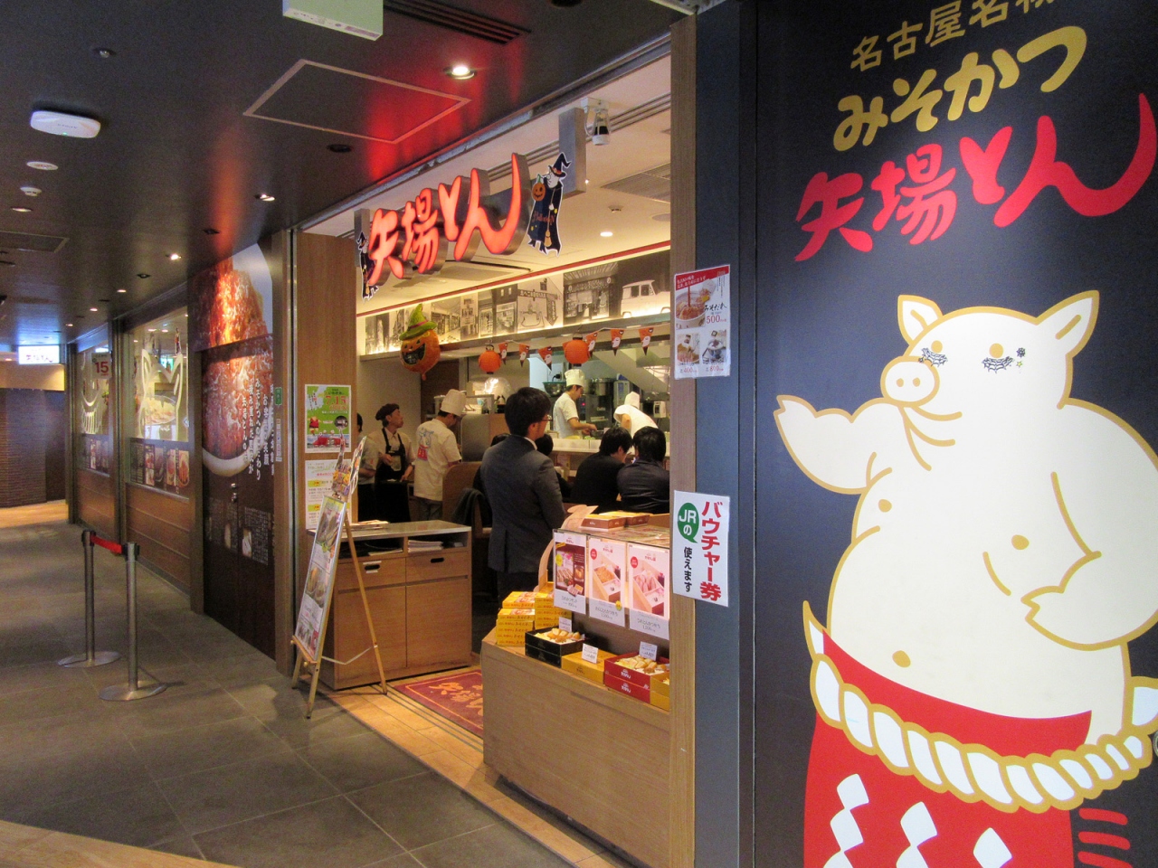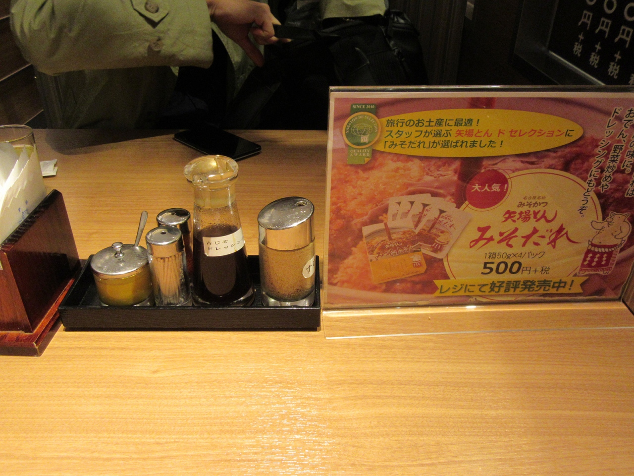 「矢場とん」さんでは”みそかつ”と表記していますが、ひらがなだと文章に埋もれてしまうので、ここでは味噌かつとします。家賃の高さで言ったら日本最高峰のレベルと思われる「グランルーフ」内のお店ですから、とにかく合理的にお客さんを詰め込みたいという思いが垣間見えるのが、調理場周りのカウンター席、そして相席を前提とした仕切り版付の4人掛けテーブル席…勉強になります。椅子の背がブタなのも可愛いですね。さて注文したのは”わらじとんかつ定食”です。お皿に盛られた2枚のとんかつの片方には既にソースがかけられており、もう一つは目の前でゾル状の味噌だれがドバドバとかけられます。「矢場とん」さんの味噌ダレは辛みが少ないことは知っているので何も感じませんが、知らない人であればビビってしまうと思います(笑)。久しぶりの「矢場とん」ですが、このわらじとんかつを食べたのは初めてでした。実は私が好きなのはゲル状の味噌ダレなのですが、こちらの味噌ダレもありだと思います。ただ肉質は今一歩。今まで「矢場とん」さんの肉で不満をもったことがなかったので、わらじとんかつ用の肉がそうなのか、とんかつ全体がそうなったのか…。次回は他のメニューを試してみたいと思います。また若いアルバイトのような店員の接客も今一歩、接客マニュアルはどうなっているのかな?