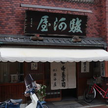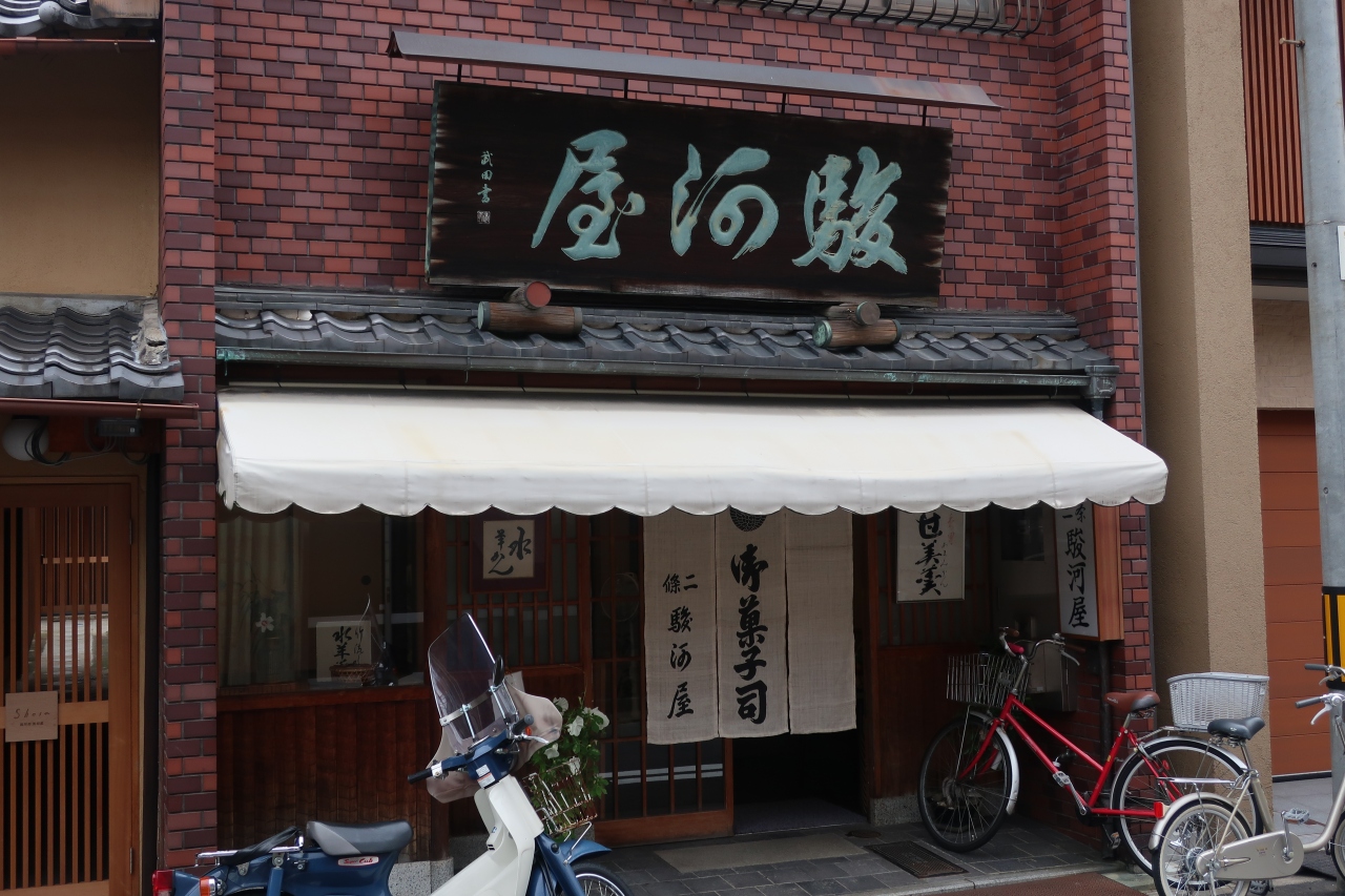 二条通り沿い、新町通りと衣棚通りの中程に和菓子の二条駿河屋があります。住宅街の中にある煉瓦貼りのビルの1階に店があり、「駿河屋」と書かれた大きく古そうな看板が目立ちます。暖簾を潜って中に入ると京都らしい、こじんまりとした店内では色華やかな干菓子が並びます。お薦めは餡を糖衣で覆った松露。お茶にとっても合います。お土産にも良いですよ。京都には二条~~と言う名の和菓子店が多いのはなんでなんでしょうか?