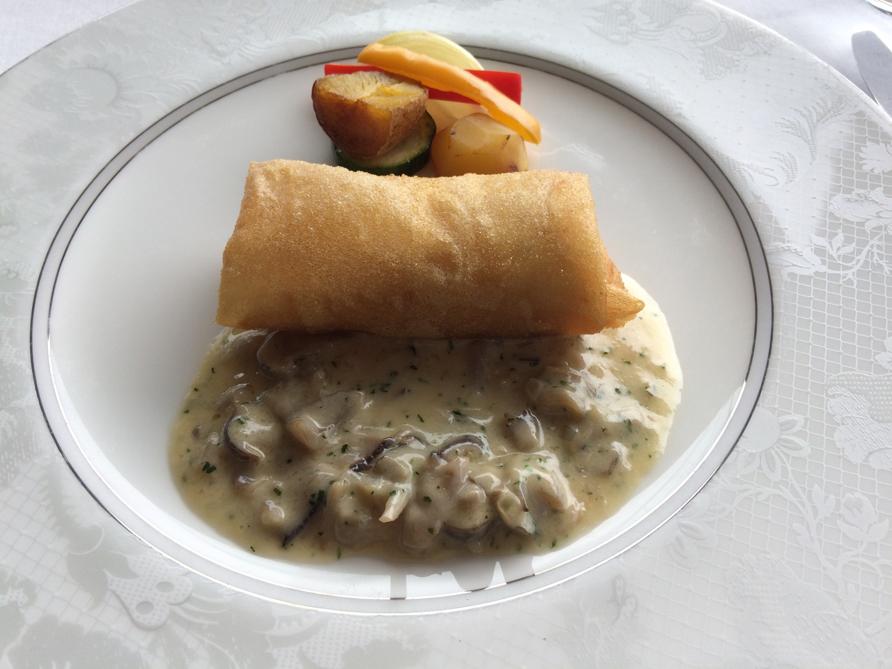スープにミネストローネ、メインはヒラメをクレープ生地のようなもので包んで揚げてあるものにキノコのホワイトソースがかかっていて、また食べに来たいと思うほど、すごく美味しかったです。パンはバターロールとフランスパンが付き、フランスパンはお代わりもお願いしました。デザートはいつもこちらのホテルで買うのとは違う濃厚なチーズケーキで、これも美味しかったです。コーヒーのお代わりも頂き、大満足ランチでした。