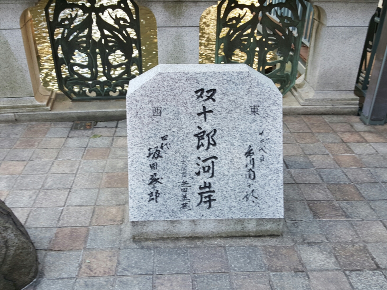 この河岸には名前がなかったのですが、日本橋架橋100年祭で 坂田藤十郎丈と市川團十郎丈による船乗り込みが行われ、この両丈の乗り込みを記念してこの名前が付いたとか^^;