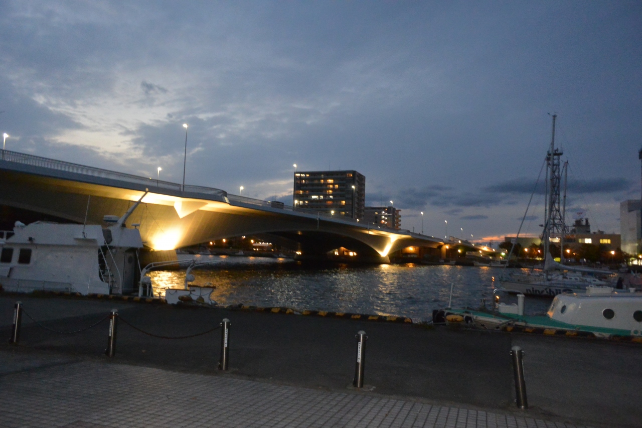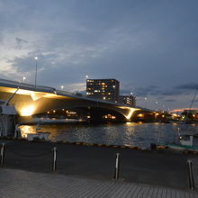 萬代橋よりひとつ下流に架かっている橋です。歩いて渡りましたが、歩道・自転車道もかなり広くとってありました。欄干などにはそれほど特徴的なデザインはありませんでしたが、橋を横側から見ると、アーチのフォルムがなかなかきれいでしたよ。