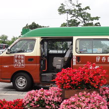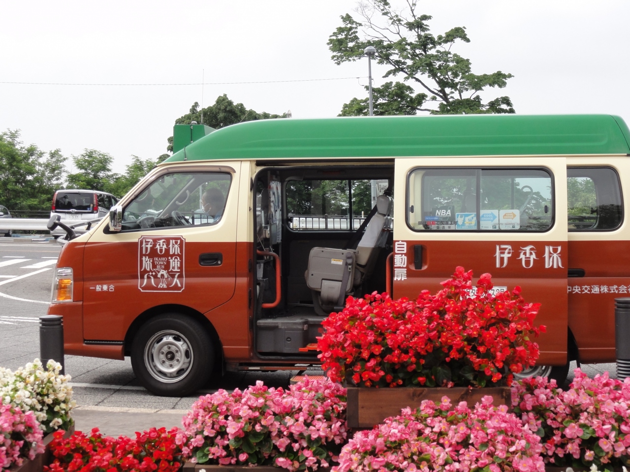 伊香保神社の先でバス停を見た時、こんな山の中にどうやってバスが来るんだろうと不思議に思っていたら、バスを駐車場で発見。なんと8人乗りの小型バスでした。1乗車100円と安いですが、本数が少ないので利用しにくいです。