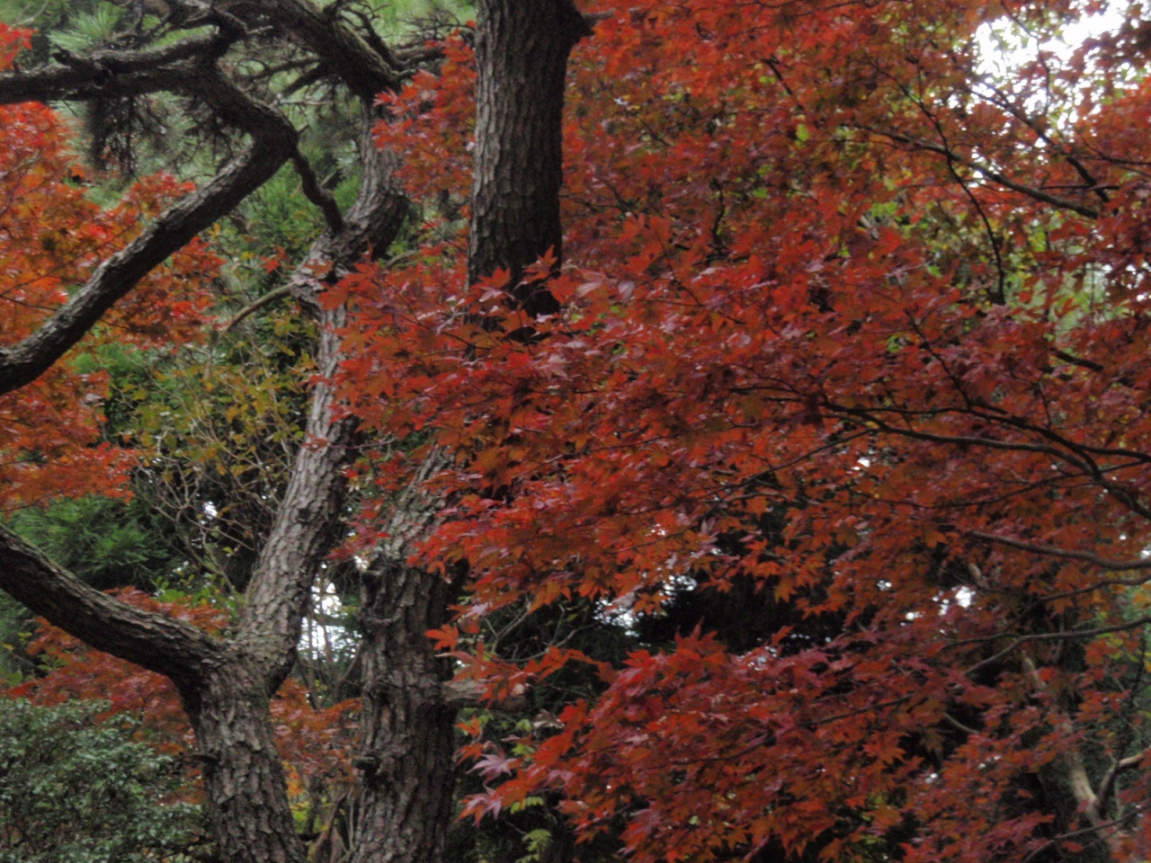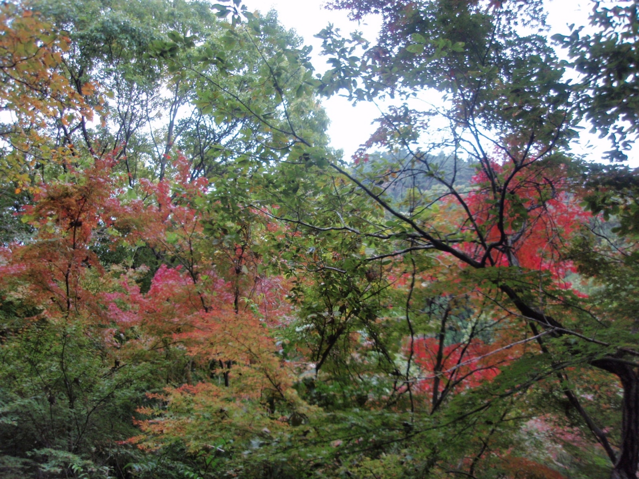 阪急御影駅から寒天山道を経て記念碑台、古寺山、神鉄六甲駅まで紅葉を見にあるきました。1か所では多くの紅葉は見られませんでしたが、登山道中の寒天山道途中、ケーブル山上駅からの道、シュラインロードのところどころに紅葉を見ることができました。記念碑台のドウダンツツジは真っ赤に紅葉し、きれいでした。記念碑台付近の紅葉は別にして時期的には早いようでした。天気が曇り時々雨であったので、紅葉は映えなかったのは残念でした。本日のコースは前半の寒天山道の登り約70分と古寺山への石道は急登りの連続でかなりハード。標高差750M,歩行距離15KMと長く、またウップダウンも多くありハードなコースでした