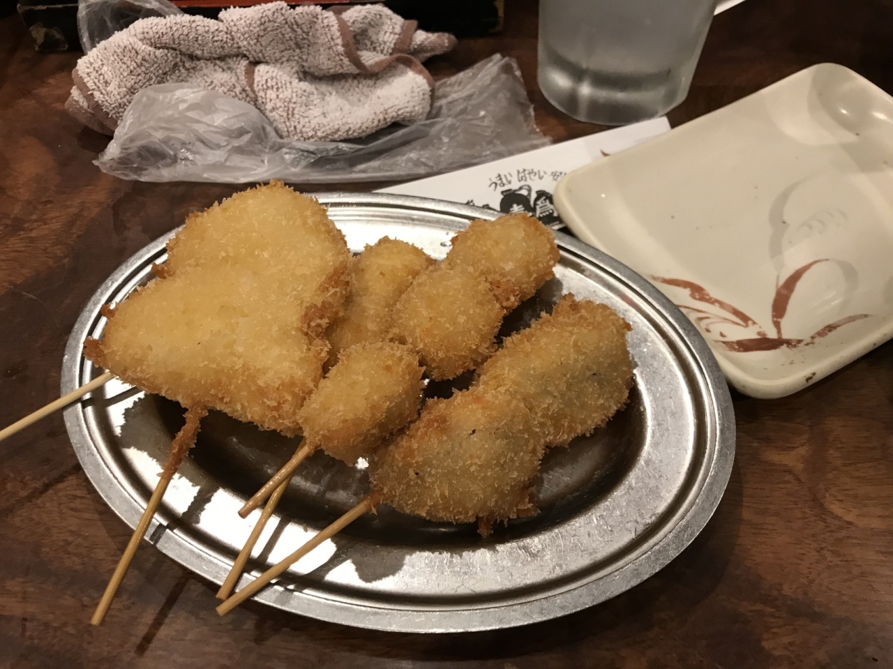 焼酎プレーン2杯と串揚げ5本で¥1000強とかなり安い価格で飲めました。この辺りは立ち飲み屋が多く、もう少し安い価格で飲める店もありそうですが
